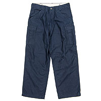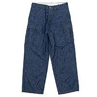 「僕の考えた最強のロボット」的に、好きなディテールを一着に。1ポケットのファーストタイプ、フラップ裏はライトオンスが使われるところ少し豪華に以前作った抜染・ポルカドットを。ウェスト調節はバックルではなくボタンで。バックルはどうしても、椅子の背もたれなどを傷つけることがあり、その心配を無くすため。