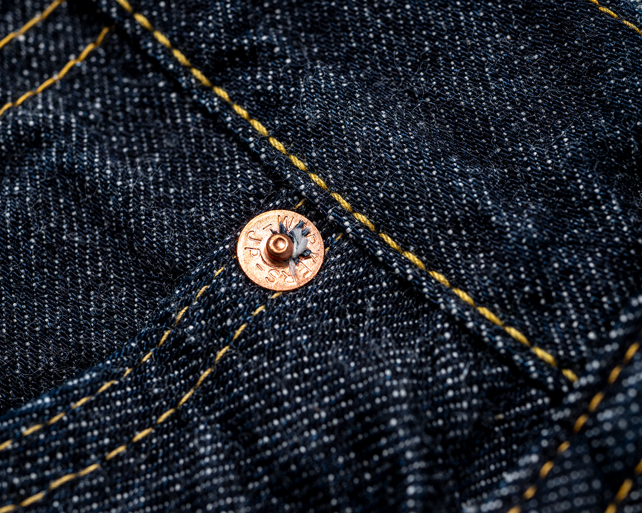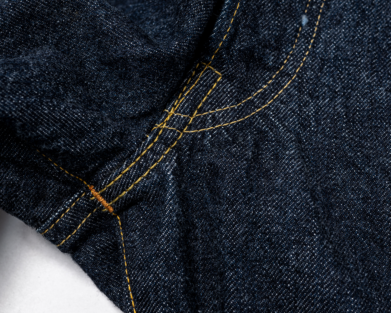 大戦風というだけあり、やたら長いクインチ(脇の倒しステッチ)。全体的にイエローばかりのステッチ。リベットの打っていないコインポケット。