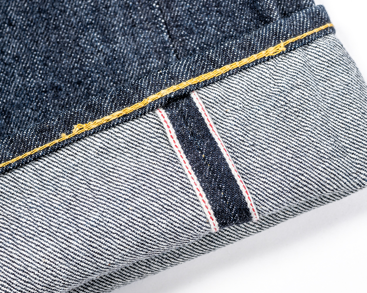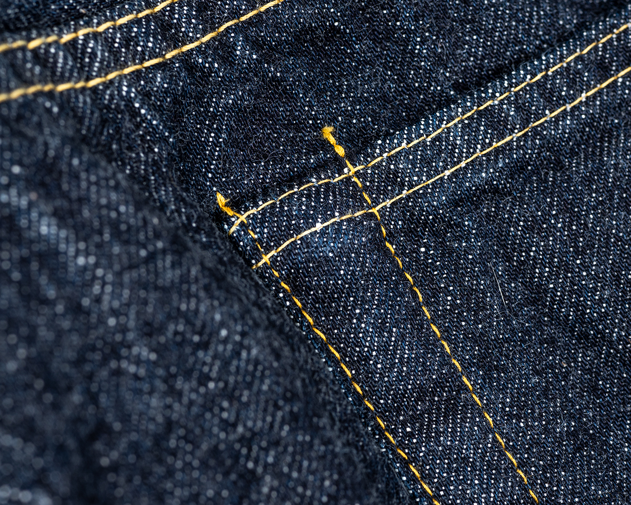 通称「小股」という左右の縫い合わせ部分。ここも黄色ステッチ。場所によって、糸の太さ・目数。チェーンステッチ、シングルステッチを使い分けるのは、いわゆるジーンズ作りの「文法みたいなもの。これが結果的にジーンズ独特の立体感を生み出してくれます。