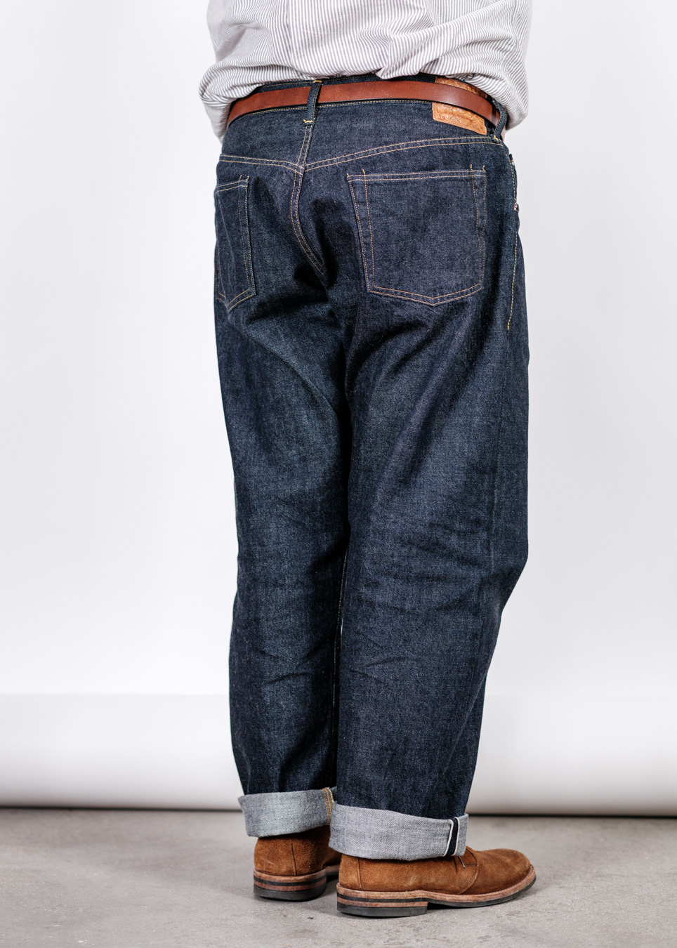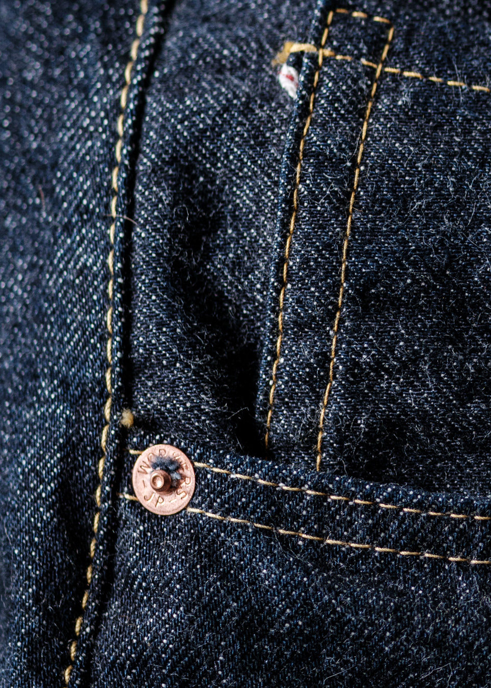 あえてボタンは刻印入り。コインポケットにリベットは無しで、あえて耳がチラっと見えるように折ってもらっています。個体差はありますが。