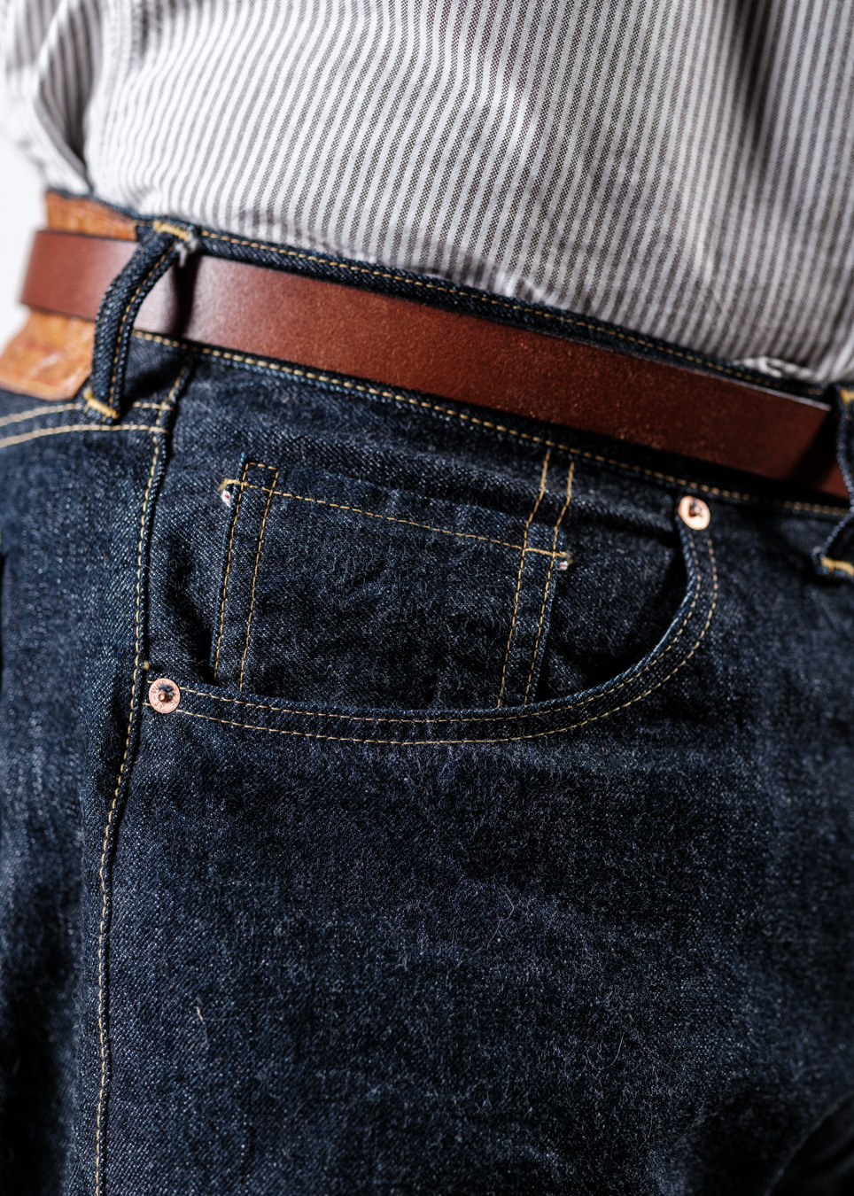 そういうこまか~い事が積み重なって、ジーンズは独特な立体感が生まれてきます。アップにするとよくわかる。