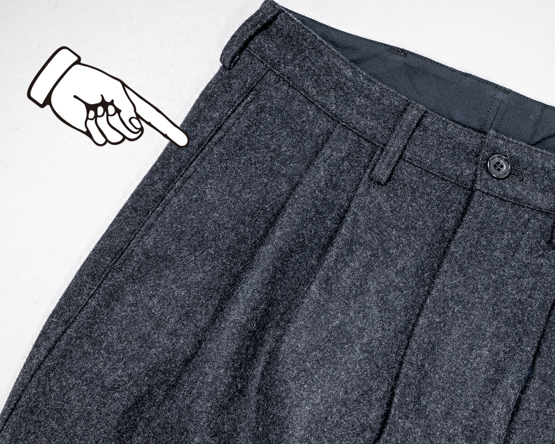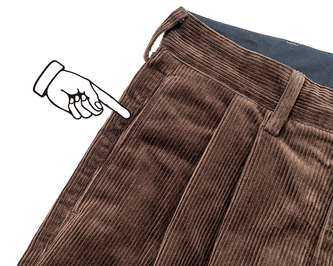 脇ポケットは縫い目利用なのでほとんど見えない。手は斜め切り替えのほうが入れやすいのですが、この脇縫い目に手を入れたとき、ちょっと胸を張るような姿勢になる。私は、あの恰好は好きなのです。80年代っぽいというか。