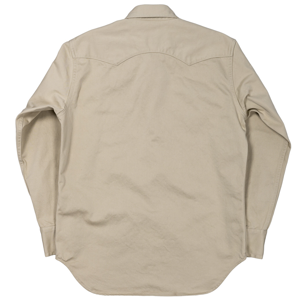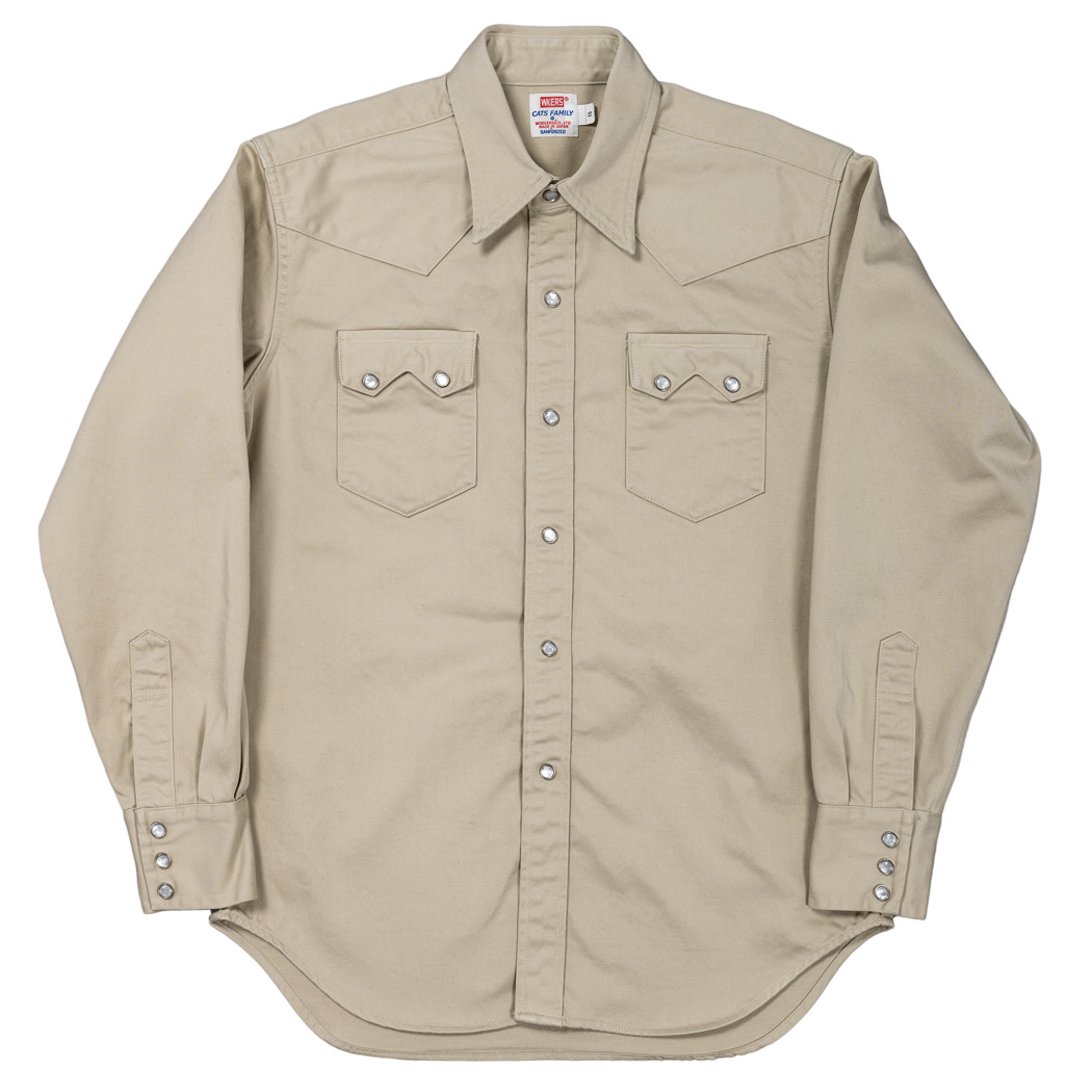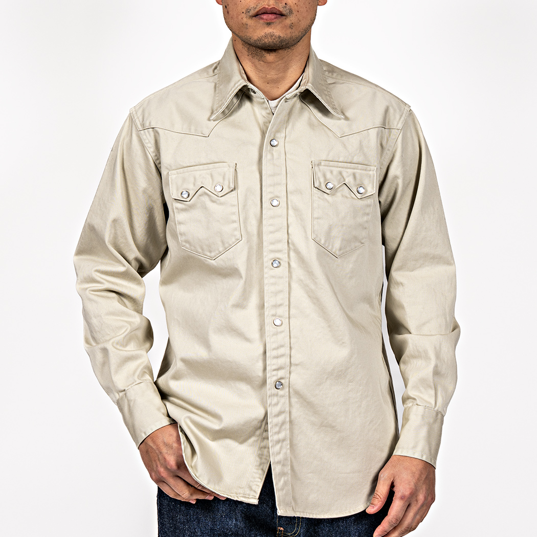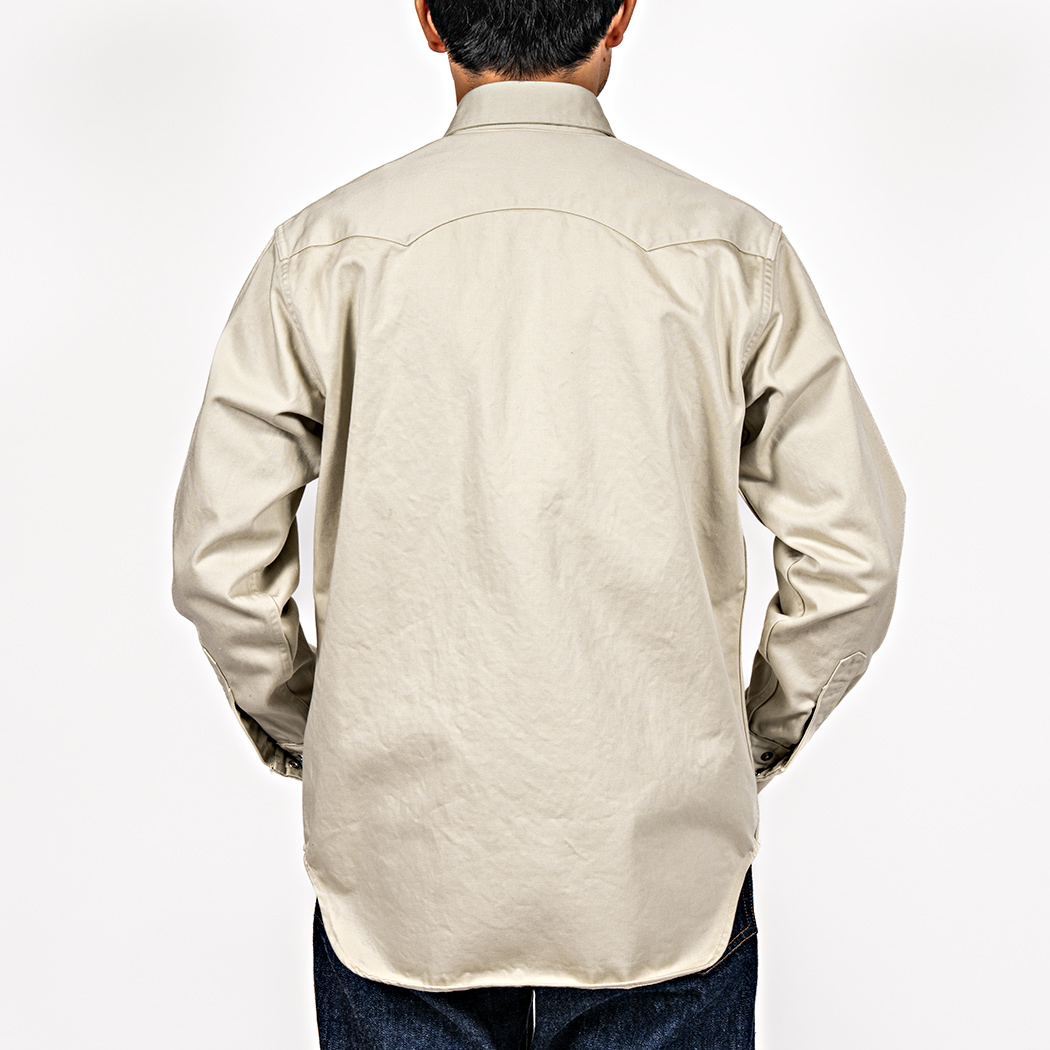 シルエット、ベースはワークシャツ。オリジナルのウェスタンシャツはウェスト絞りがきつく、丈がとても長い独特なシルエット。 WORKERS 版は丈が76 センチほどでぎり、出しても着られる、入れてもたくし上がってきません。