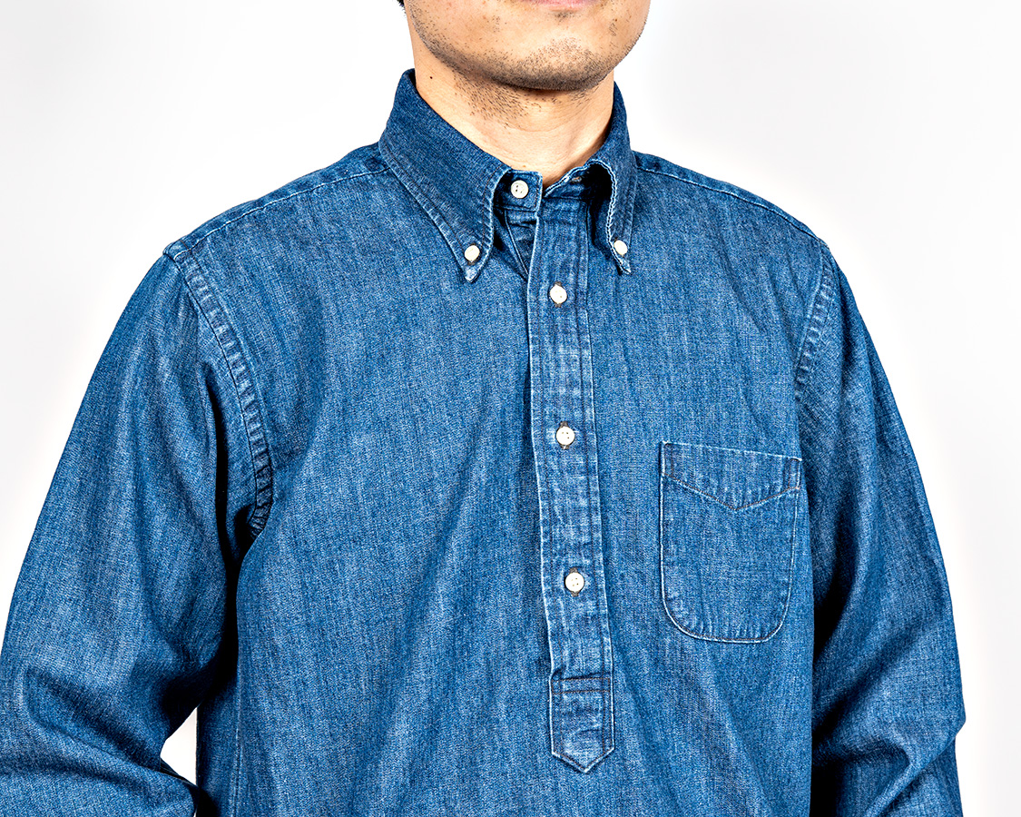 が、IVYといえばプルオーバーボタンダウン。ポップオーバーなんて言ったりもします。今までは、夏用にマドラスや薄手のオックスでばかり作っていたので今回は厚手生地で。写真は7.5オンスのデニム。シャツとしてはかなり厚手。