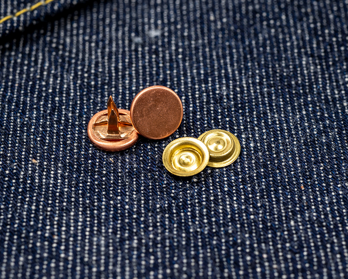 バックシンチ部分のリベット止め。正直、このリベットは飾りです。力がかかる部分ではなく、ステッチのど真ん中なので。