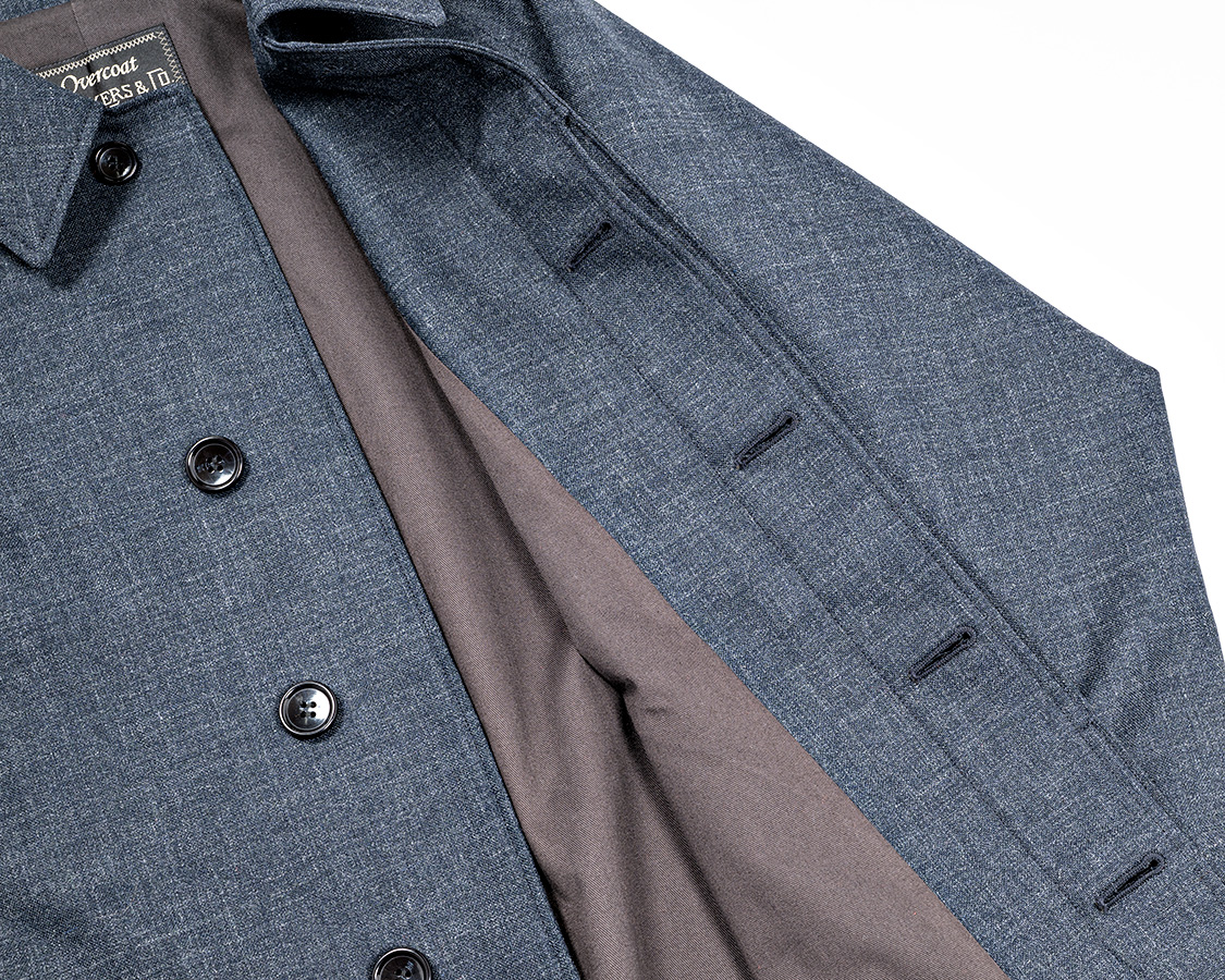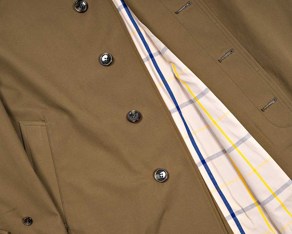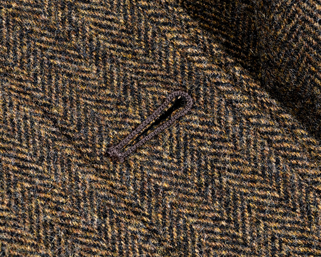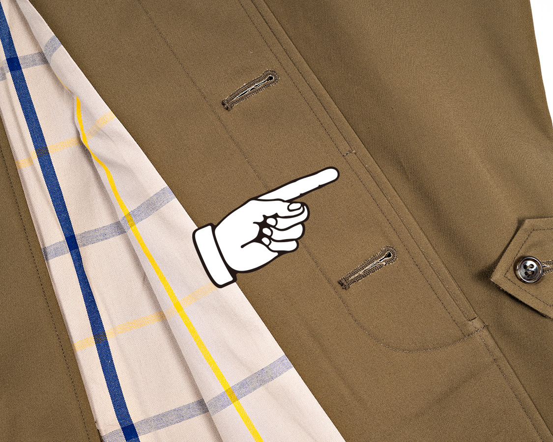 ボタンホール、この品番ははと目+小カンヌキ。やっぱりお高いコートなので、ちょっと贅沢な仕様で。