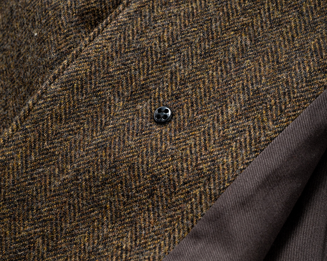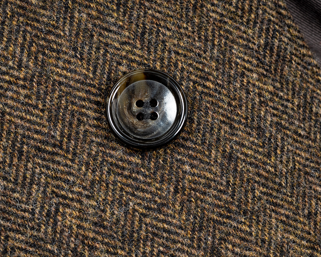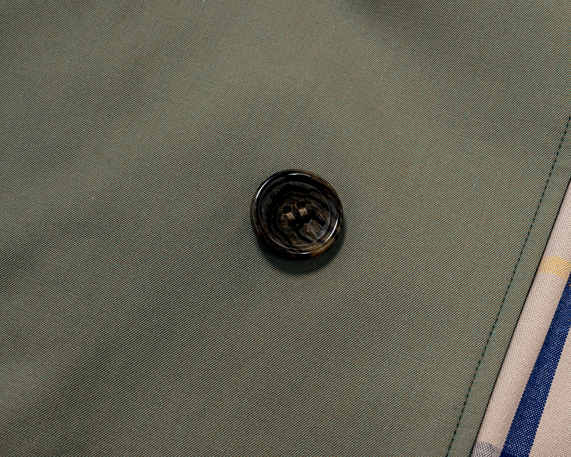 ボタンは練りボタンの水牛「風」マーブル模様。フロント4つは裏に力ボタン付き。