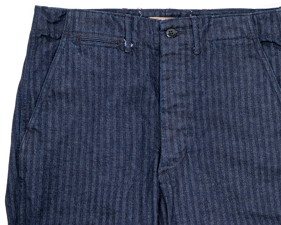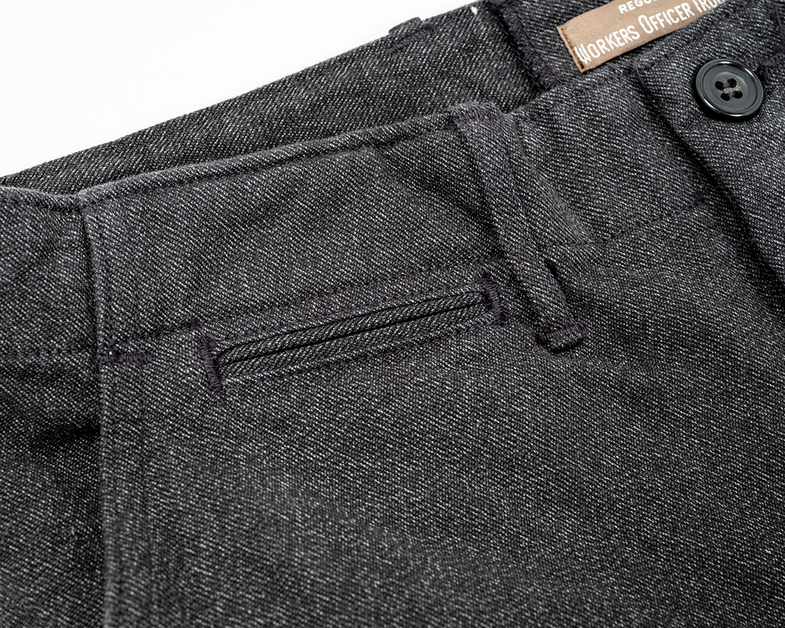 斜め切り替えポケット+細両玉のコインポケット。簡単そうで、この斜め切り替えを脇で巻き縫いが乗り越えるところ、厚みが極端に変わって縫うのが難しいのです。昔、自分で縫っても縫えないし、工場さんはみな嫌がるし。