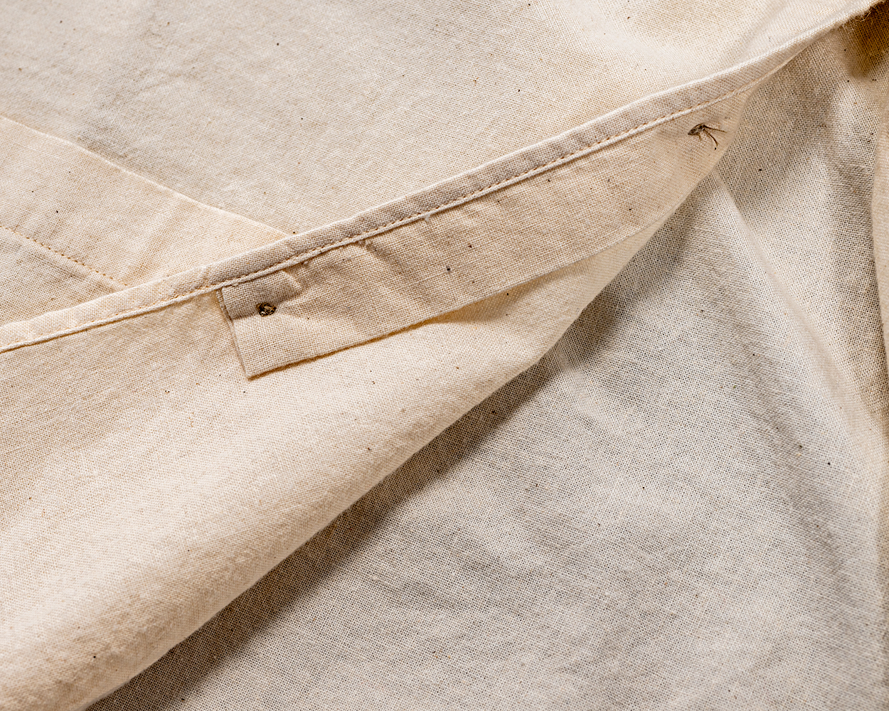 下前側は別布を流し込みながら一緒に三巻始末。さらに、ボタンを付けることで、別布がすっぽ抜けないように。