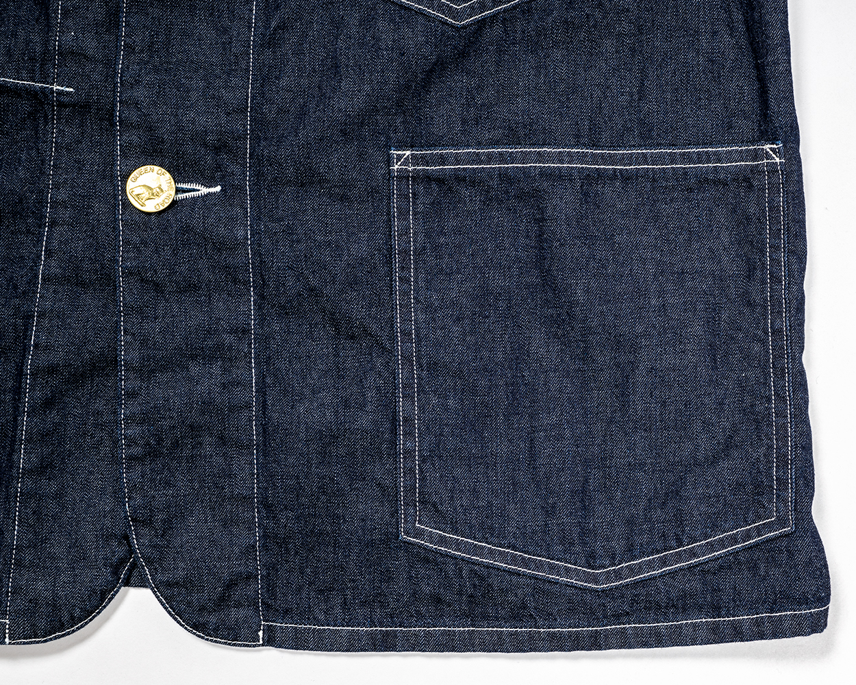 角の補強。ここはカンヌキを使わずステッチで止める。かなり古いカバーオールがモデルなので、おそらく工場にカンヌキミシンがなかったのでしょう。参考にしたオリジナルがこのような補強だったので再現しています。現代的には、カンヌキミシンを使ってもらった方が楽なのですが。