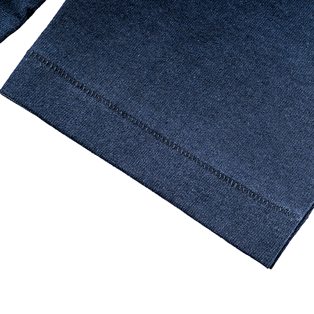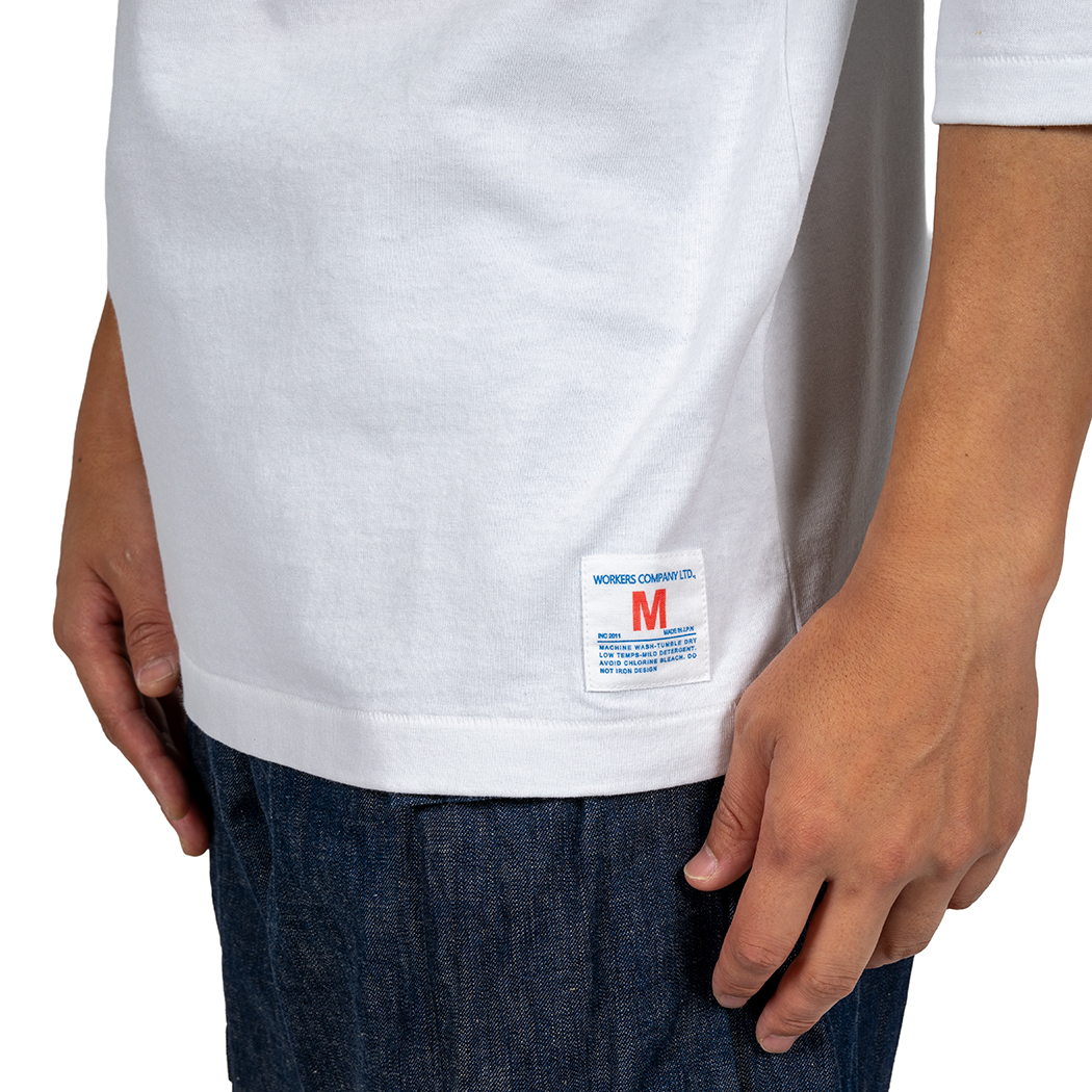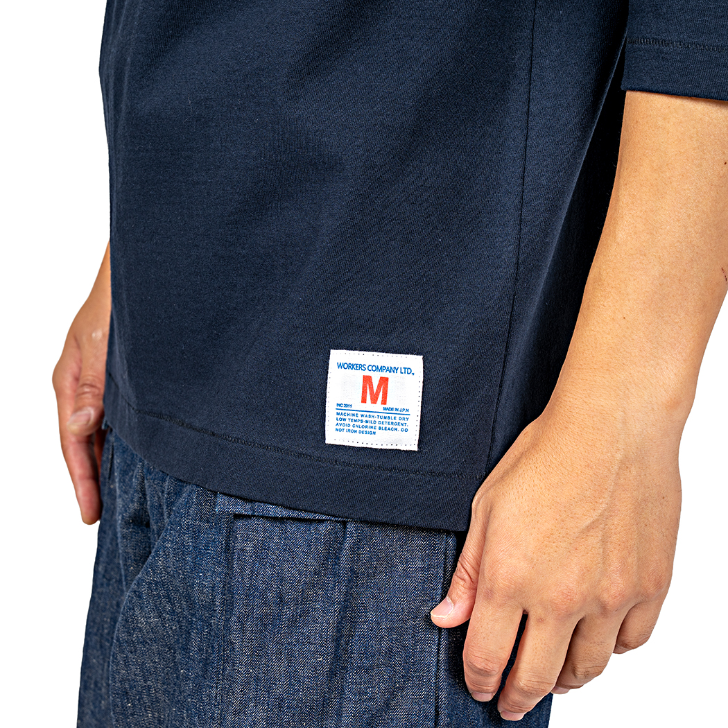 素材は16 番単糸の天竺。単糸、そう2PLY やボーダーが「双糸」に対し、糸1 本で編む「単糸」。糸の 撚り方向に生地自体が斜行(しゃこう)しています。もちろん、「セット」という工程である程度はまっすぐにしますが、 それでも完全には斜行が取れない。その若干ねじれた感じがビンテージのあのT シャツの感じでもあります。