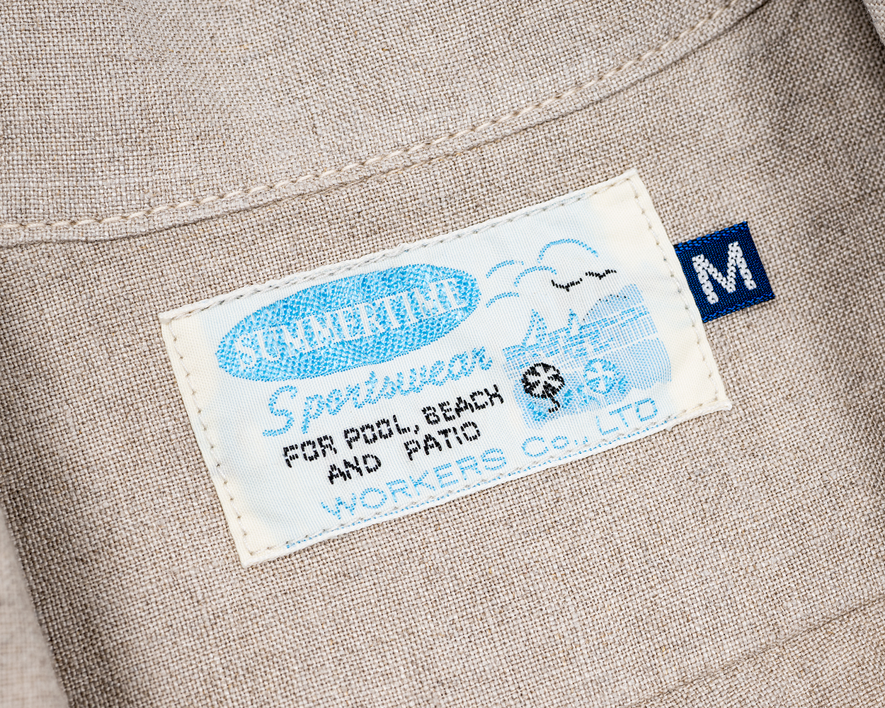 シアーズ・ピルグリムの古着 から作ったネーム。もう10年以上前ですが、出来上がった時はうれしかった。いまだに、パテオの下で夏休みなんかしたこと無いですが、買っていただくお客様にはぜひ、夏のバカンスでお使いください。