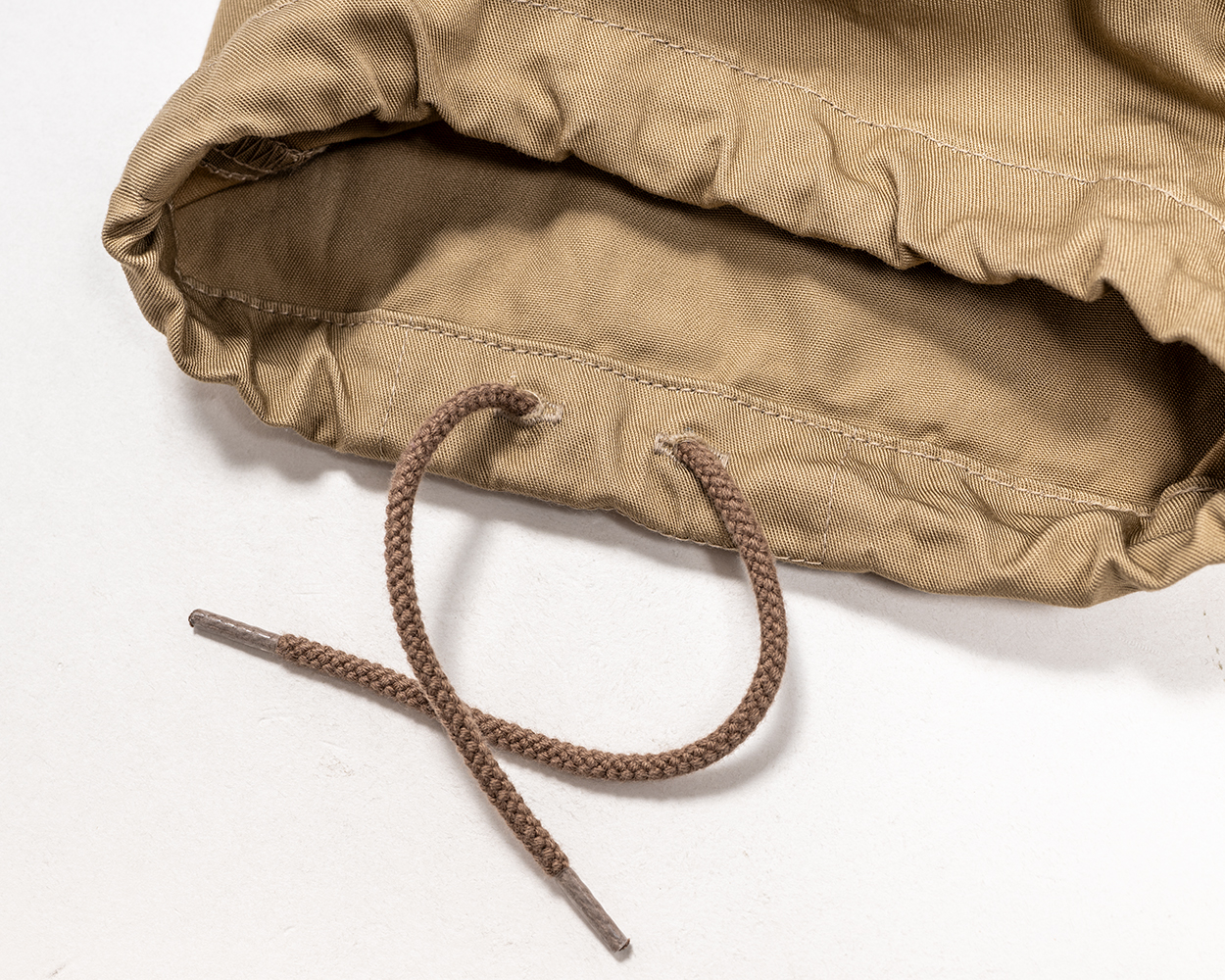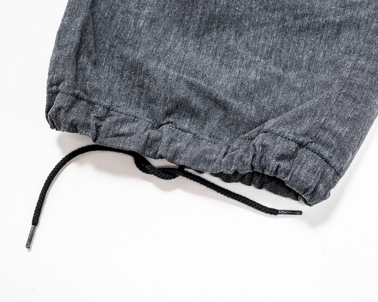裾はスピンドル(紐)あり。オリジナルのファティーグパンツは紐が抜けないようにカンドメで一部止めてしまっていますが、今回のFWPは止めていません。紐が気に入らなければ抜けます。