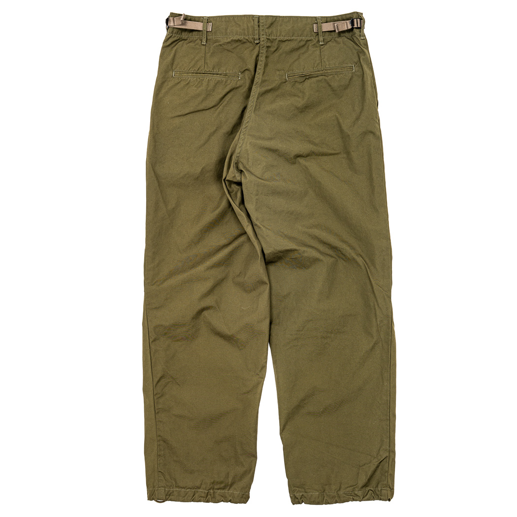 FWP Trousersの着想の元、「ファティーグトラウザーズ」で使われる、6オンス程度のコットンポプリンがモチーフ。平織りなので、ライトチノより固い手触り。 |