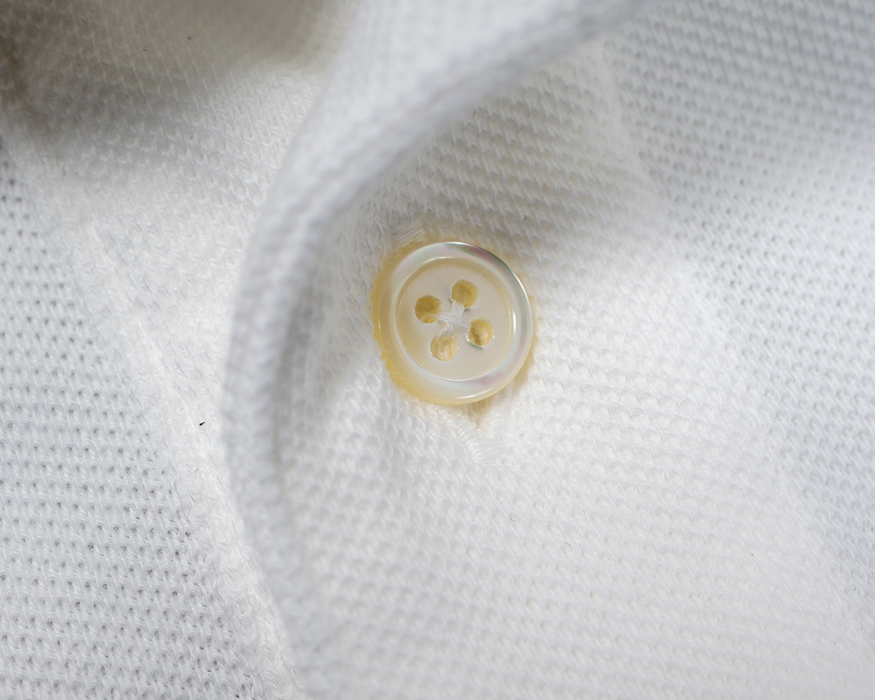 高瀬貝ボタン。製品はすべて洗い・染めが入るので、その工程の後にボタンを後付けしています。