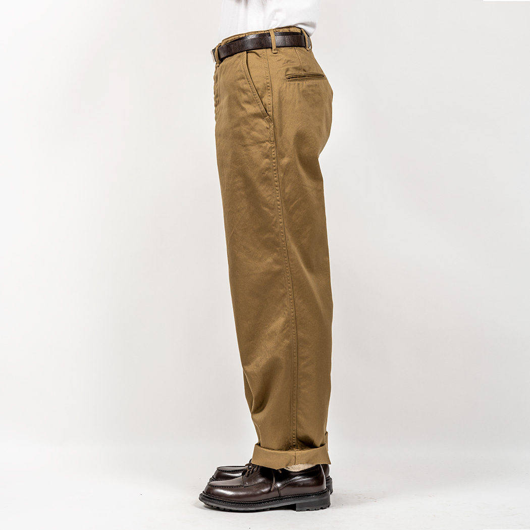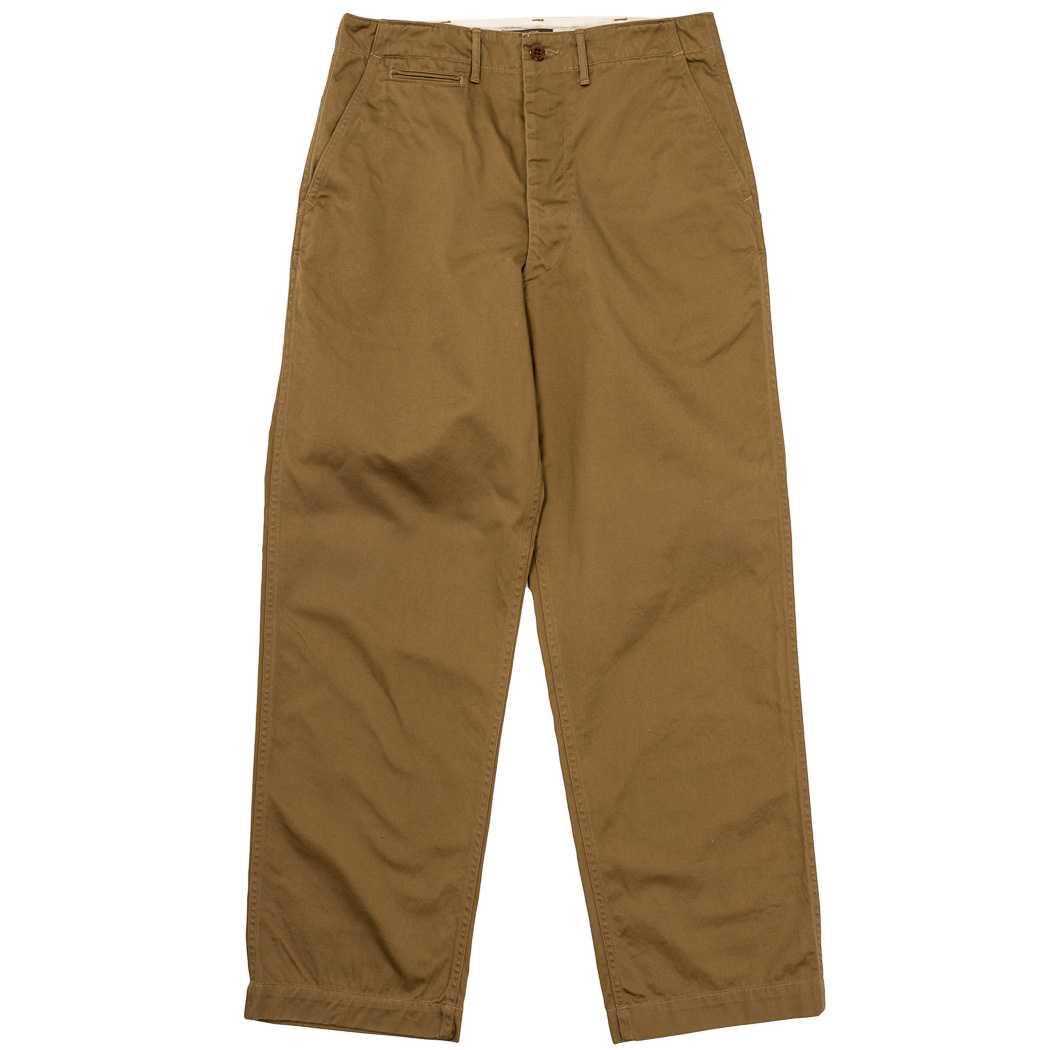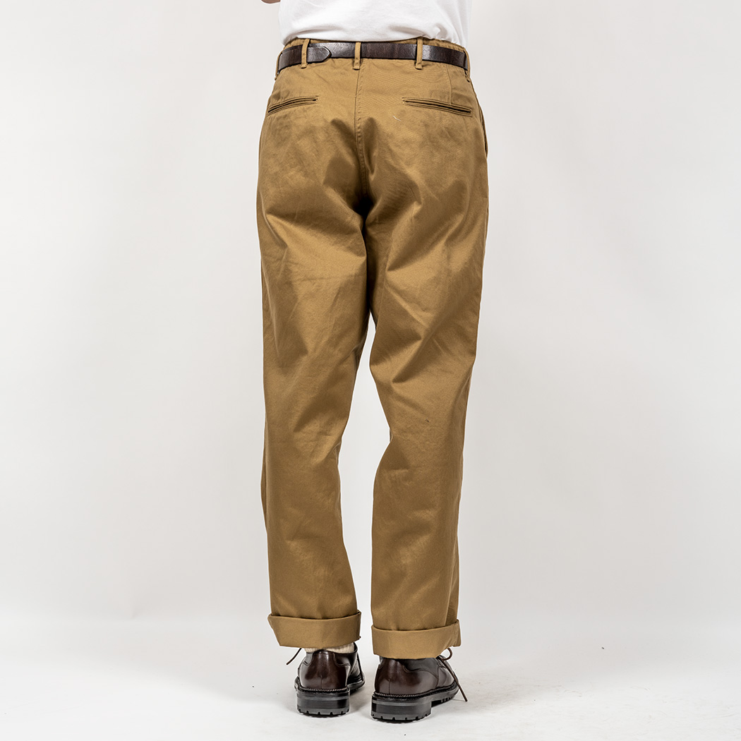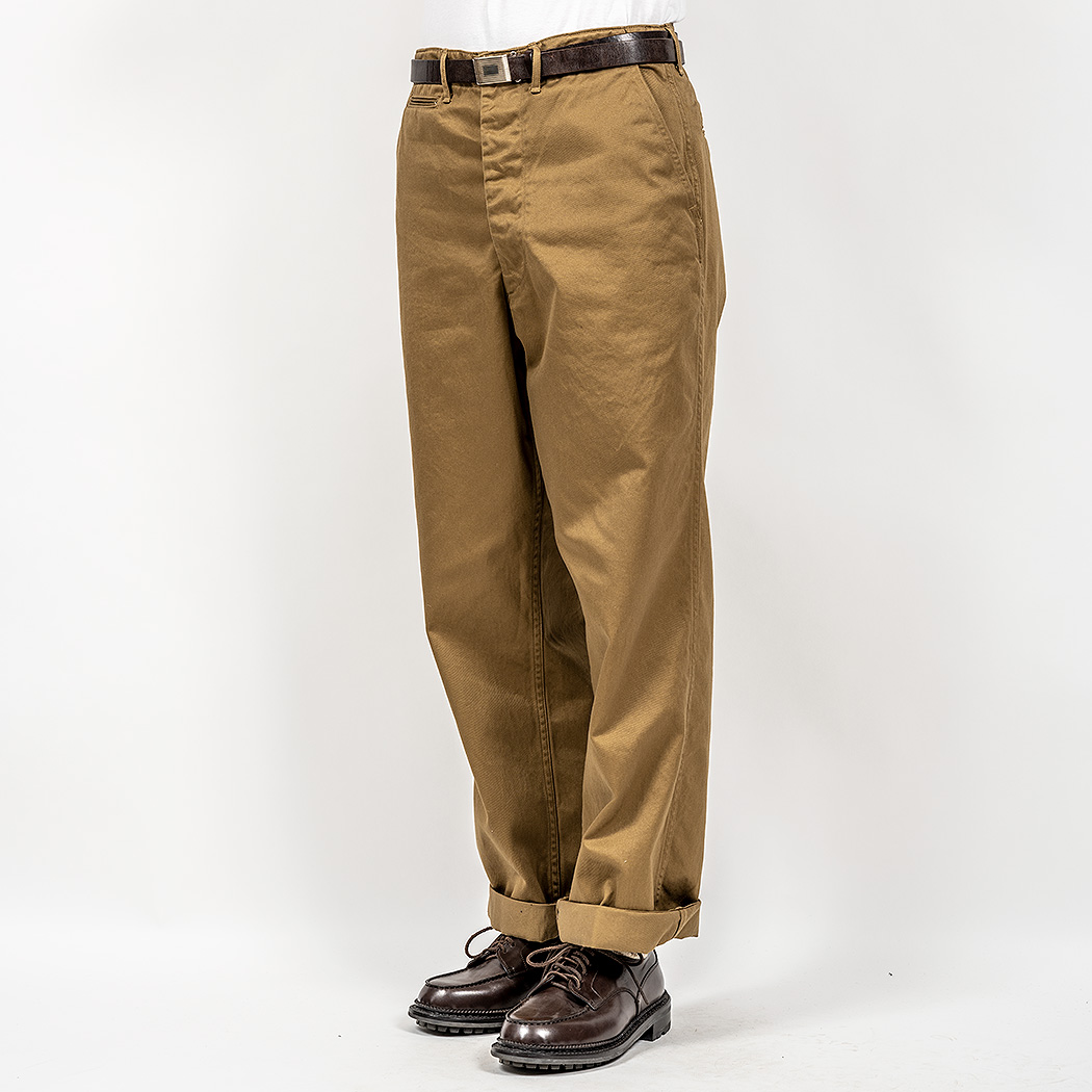 素材は定番のチノ 。USMC KhakiはWORKERS別注で、古着のUSMCと思われる茶系のベージュの個体から色を取ったもの。いわゆる「チノパン」のもう少し白いベージュとは違う。より土臭い雰囲気。