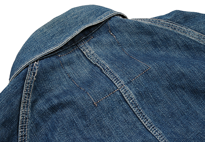 トリプルステッチの白、ラベル止めの紺が変色したステッチ、デニム生地の細く繊細な縦落ち感の対比が美しい一枚です。