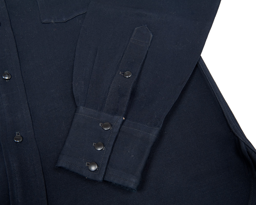 ボタンはきのこのような、独特の足がついたデザインの樹脂製。これもまた、ウェスタンシャツでおなじみのスナップボタンとは違う、シックな印象を与えてくれます。