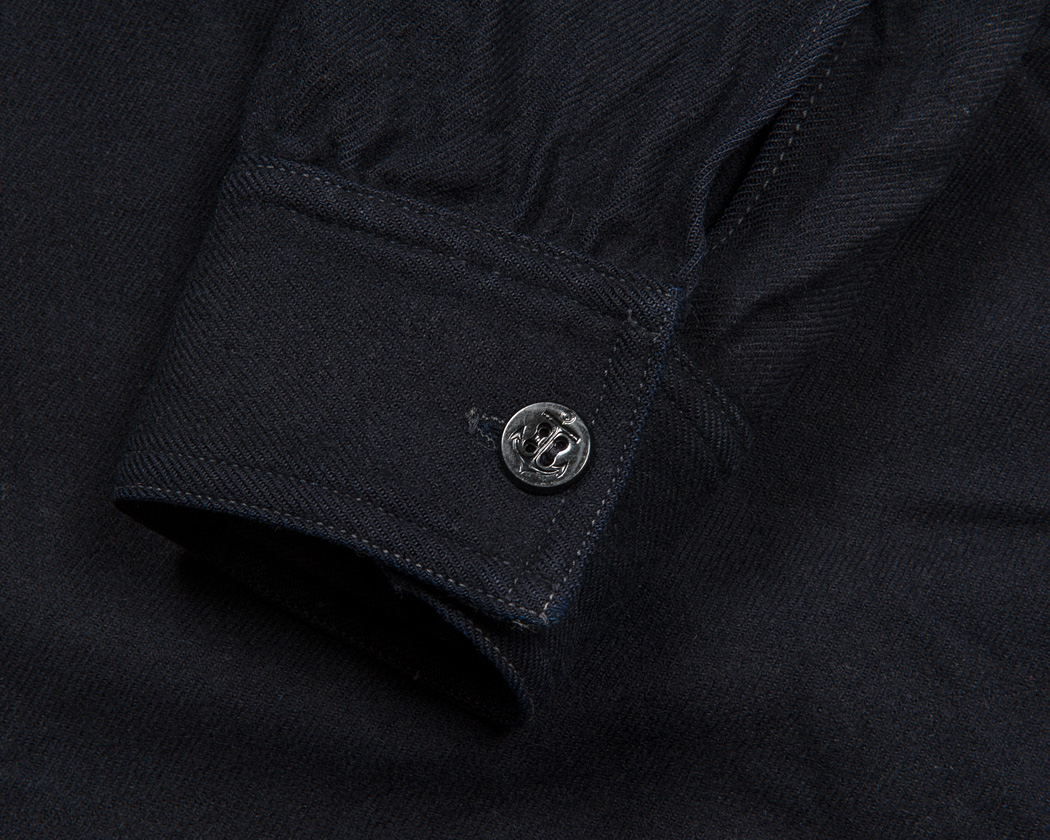 優雅にアーチを描いたフラップ、角角はステッチが行きすぎて糸のワタリが出ています。これも「出ちゃった」ですが、今見るとこのシャツ「らしさ」になっています。