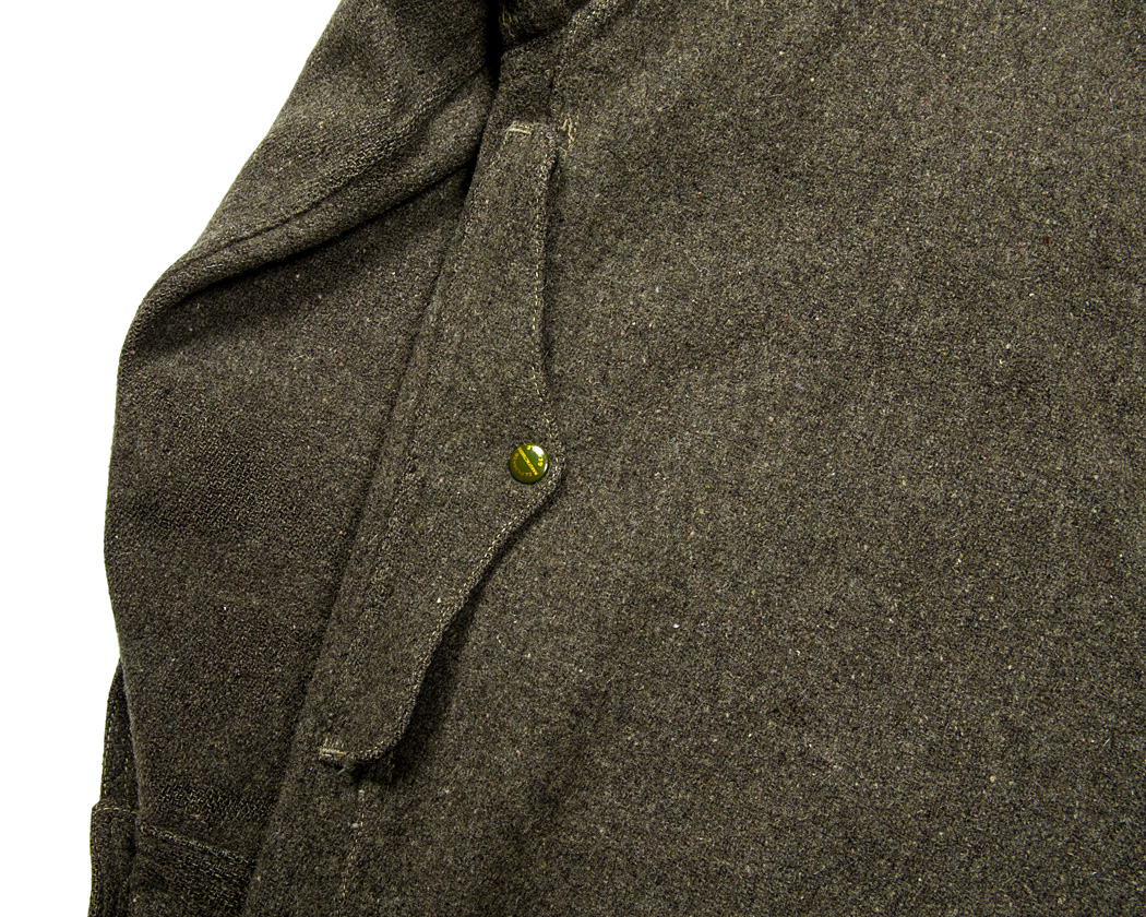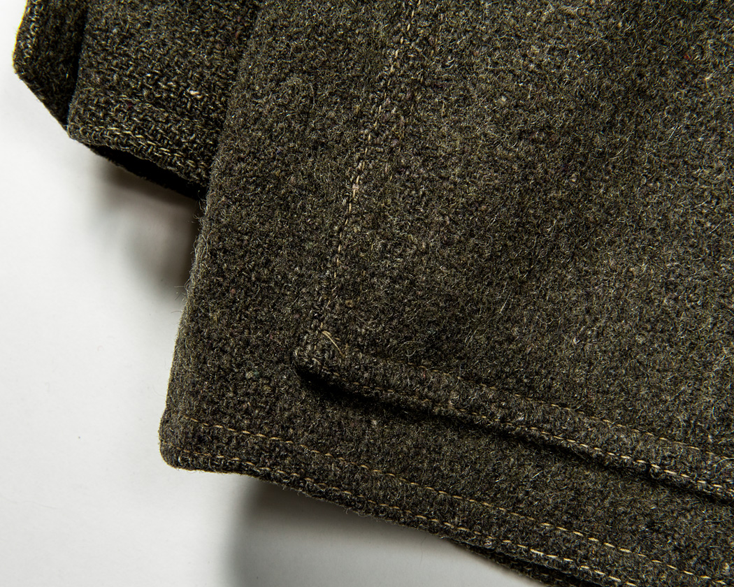 非常に太い糸で密に織られた生地である事がわかります。またダブルステッチは二本針で縫われているので、角に糸のワタリが見えます。