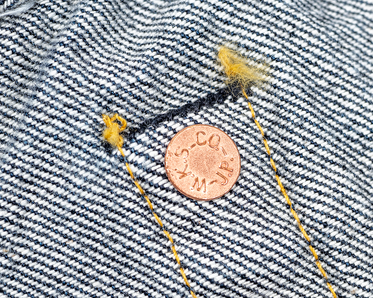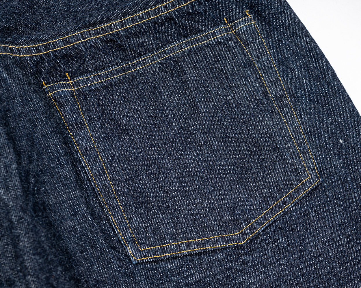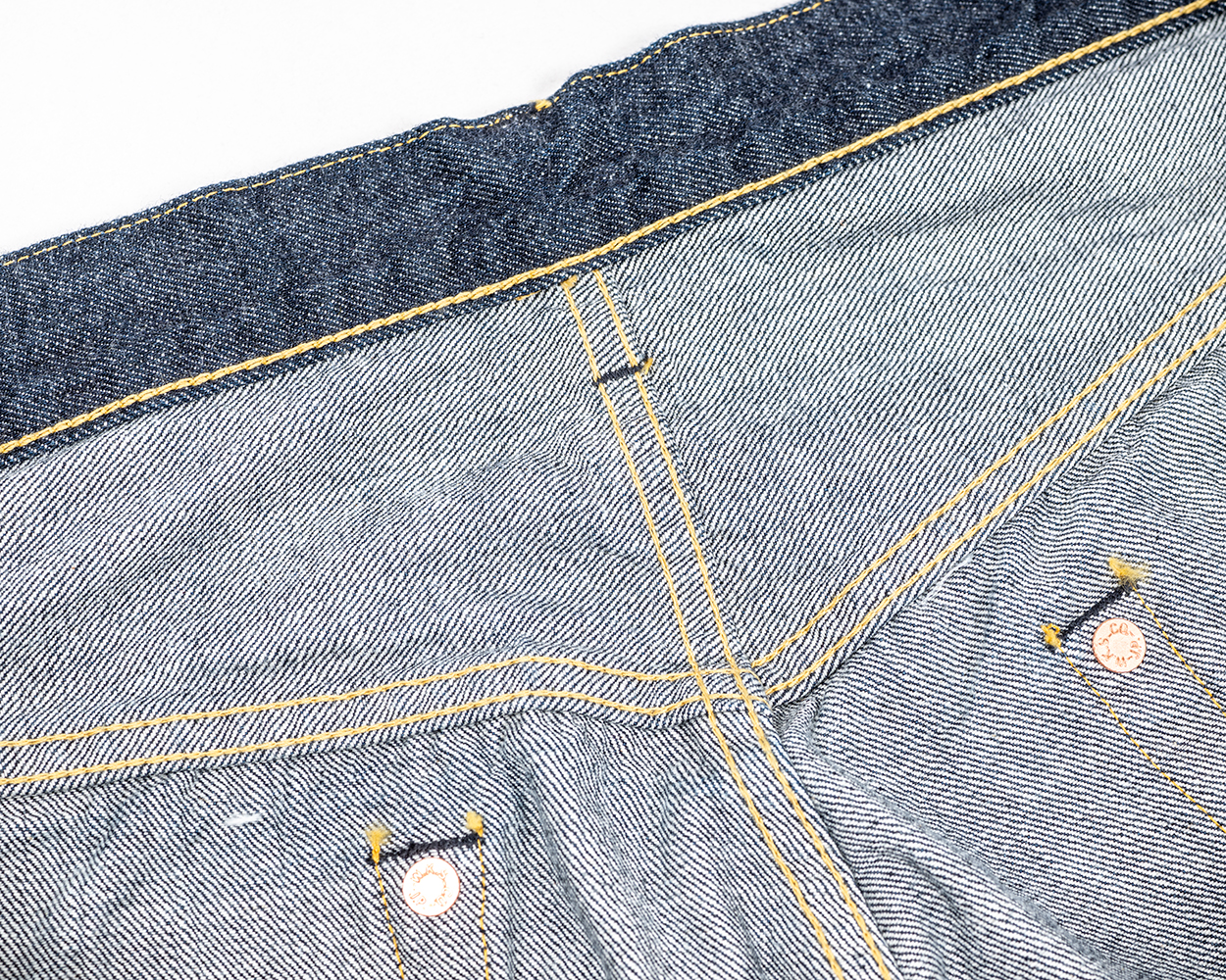 大戦風というだけあり、やたら長いクインチ(脇の倒しステッチ)。全体的にイエローばかりのステッチ。リベットの打っていないコインポケット。