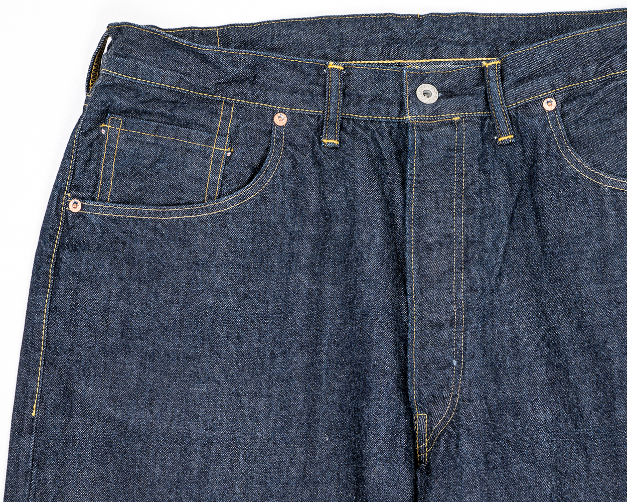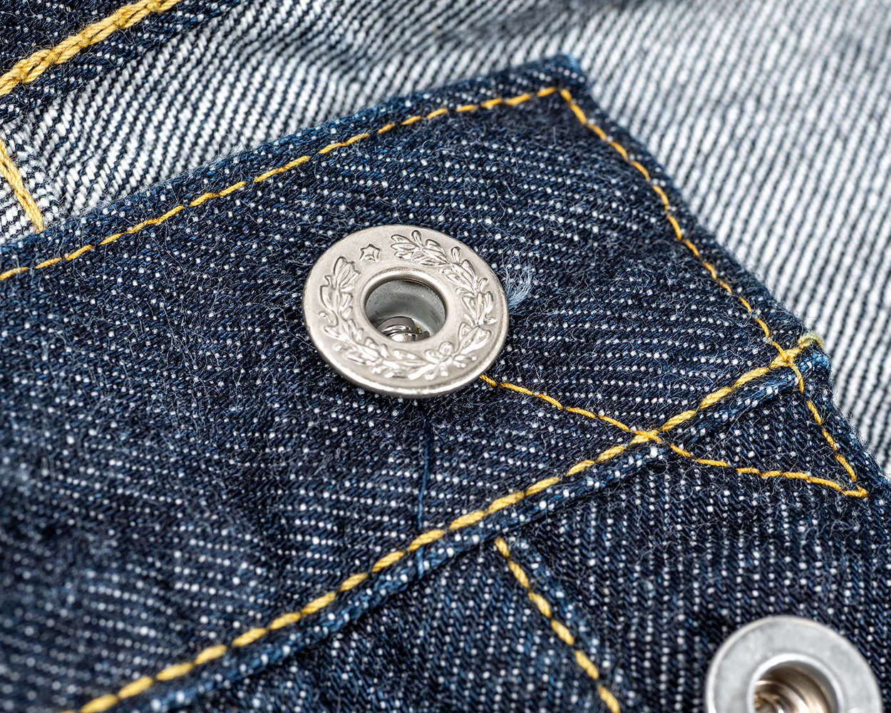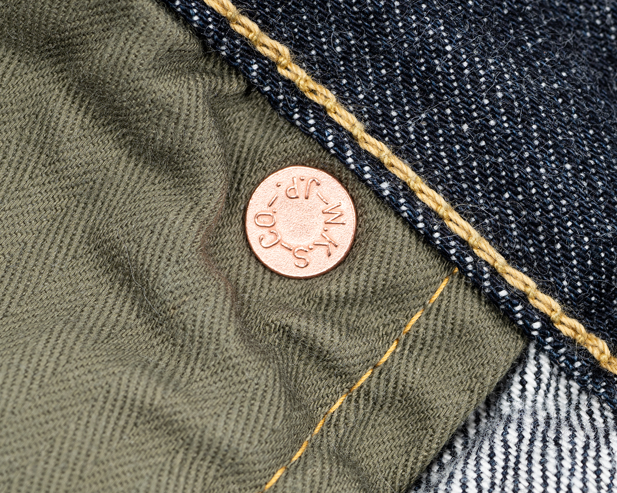 大戦風というだけあり、やたら長いクインチ(脇の倒しステッチ)。全体的にイエローばかりのステッチ。リベットの打っていないコインポケット。