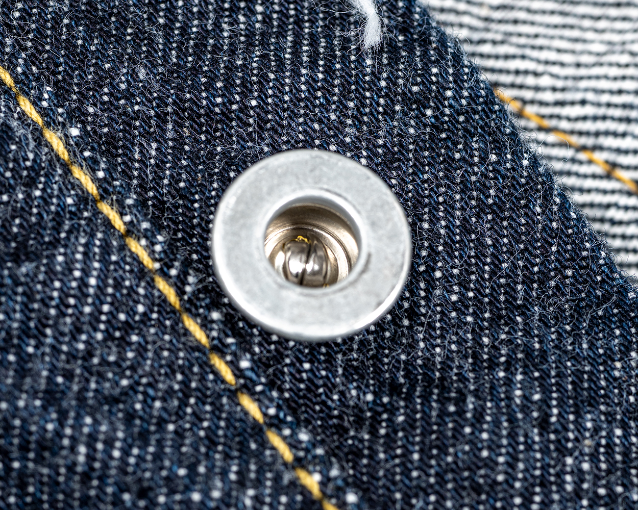 ループは真ん中が盛り上がった金具(ラッパ)で縫製。色が落ちだしたときに、真ん中がよく色落ちするように。