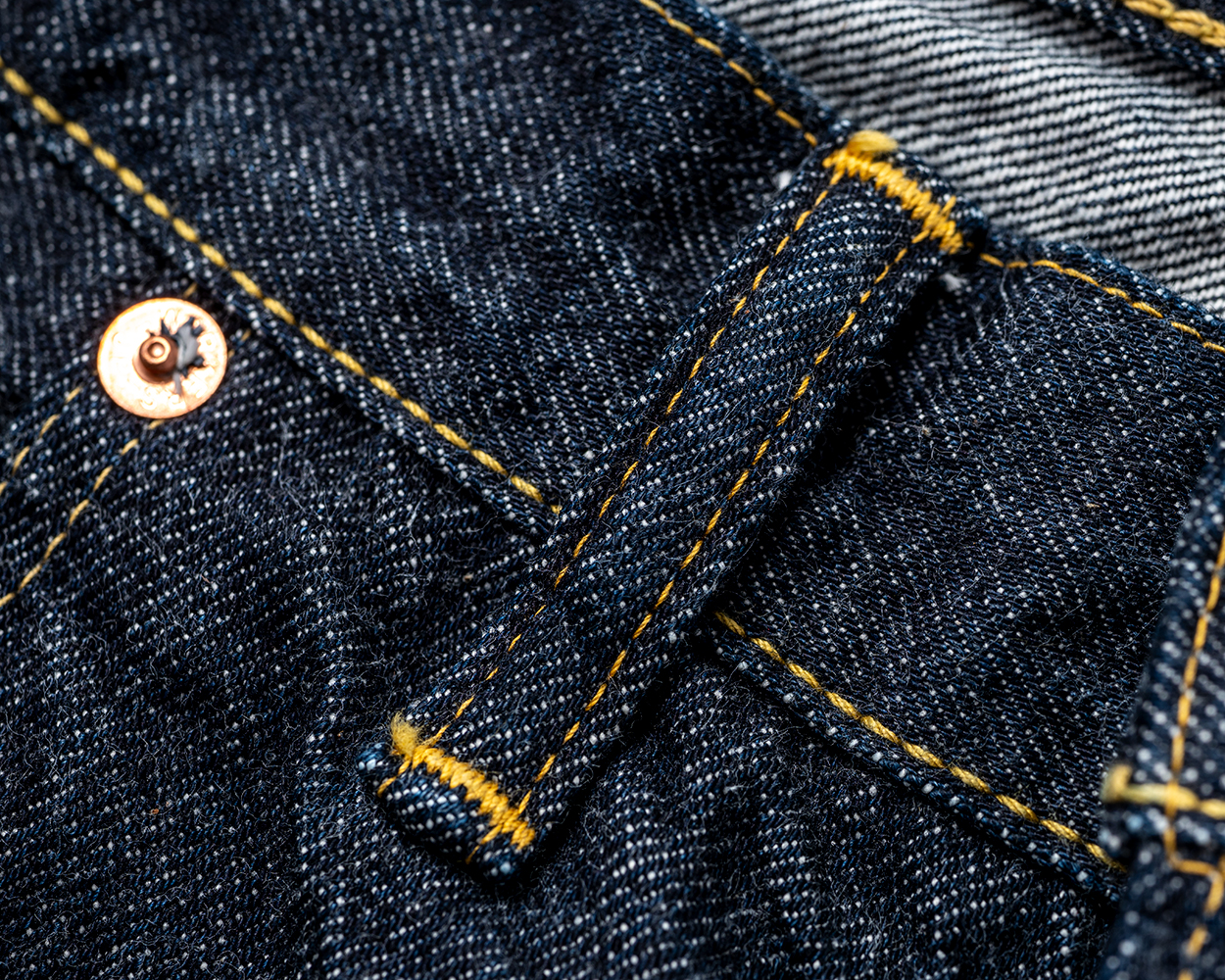通称「小股」という左右の縫い合わせ部分。ここも黄色ステッチ。場所によって、糸の太さ・目数。チェーンステッチ、シングルステッチを使い分けるのは、いわゆるジーンズ作りの「文法みたいなもの。これが結果的にジーンズ独特の立体感を生み出してくれます。