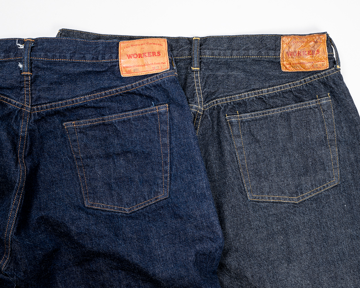 左がWORKERS、今までの定番801。インディゴ100%染色で、青さが際立つのが特徴。右が新作、S801。インディゴで染めてから、最後に、表面に硫化で黒っぽい色を載せています。ただ、あくまで黒は表面に乗っているので、落ちだすとインディゴが見える。でも、残る部分もあり、いつもの801より濃淡出るんじゃないか?という生地です。