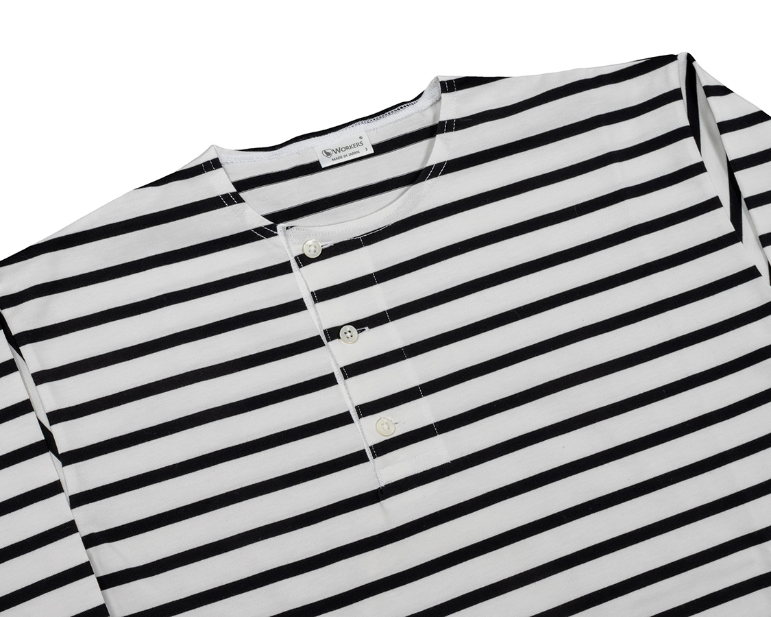 脇よりにオフセットされたヘンリーネック。もともと、おそらくアメリカ物のウール肌着から着想を得た仕様。