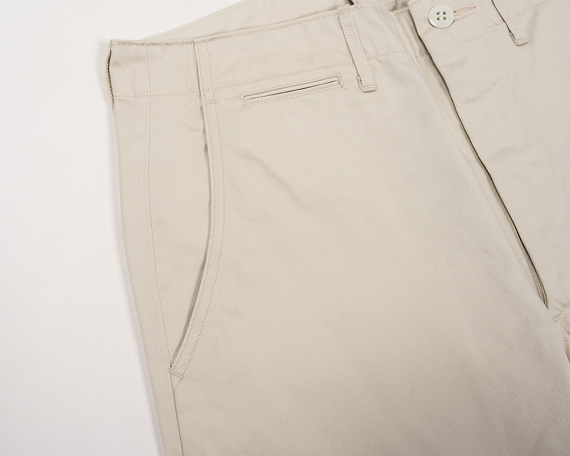 「どの工場でも作りやすい、機能的で、でも現代の効率一辺倒とは違う」そんな仕様を追及しています。ビンテージと呼ばれる古い服をたくさん見るのも、単純に「どれをコピーしようか」というのではなく、その中から「これは!」という仕様を見つけ出したい。それらをまとめ上げて「WORKERSのチノパン」を作りたい。それが、Workers Officer Trousersの「コンセプト」です。(気恥ずかしいですが)