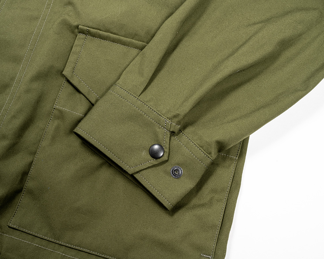 袖口、WORKERSでは昔からよくやるBIGYANKのカフスを参考にした開きの無い三角カフス。ただ今回は、袖にタックを一本入れて、より肘から袖先までを太く、ゆったりと作っています。