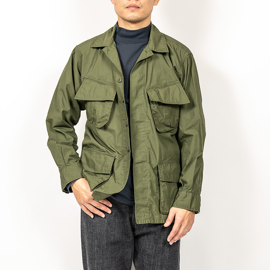 21FW から継続してファティーグジャケット。変更点はポケット。胸脇側に向かってマチが無くなる仕様。ポケットの形自体も変え、21FW とは別のオリジナル個体を参考にパターンをひき直しました。