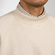 Raglan Cotton Sweater は今回同時に作った居るRAF Sweaterよりも袖が太く、首回りもゆったり。中にシャツを着ることを想定して作りました。元ネタはJohnstons のカシミアセーター。数年前、15PLY というすさまじい極厚の一枚を見つけました。値段もすごい!10万超え!どうしても物が見たくて何とか手に入れましたが、その重みにびっくり。さらにウールは重すぎると伸びる伸びる。そこで、コットンなら伸びに強いと形にしてみました。 |