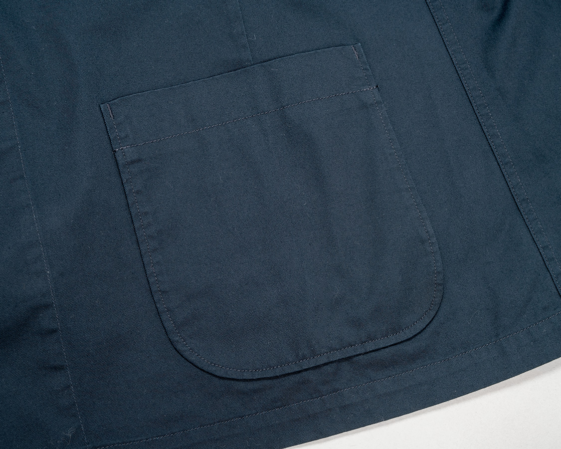 腰ポケットも胸ポケと同じ裏地付き。手を入れた時にコットンの裏地が心地よい。脇の絞り、以前は3面体を良く使いましたが今回はダーツ使って2面。そのダーツをまたぐ位置に腰ポケット。