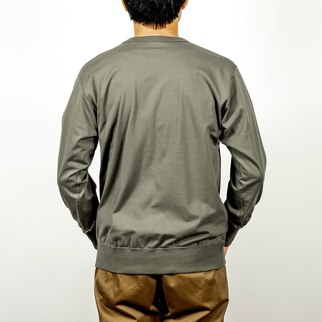 3 PLY Sweat Shirt、仕様はスウェットそのもの。前 V たたきつけ、袖口・裾はリブできゅっと絞る。首回り、リブ太め バインダー始末。首回りをリブでパイピング状に縫うので厚みが出て伸びにくい始末。