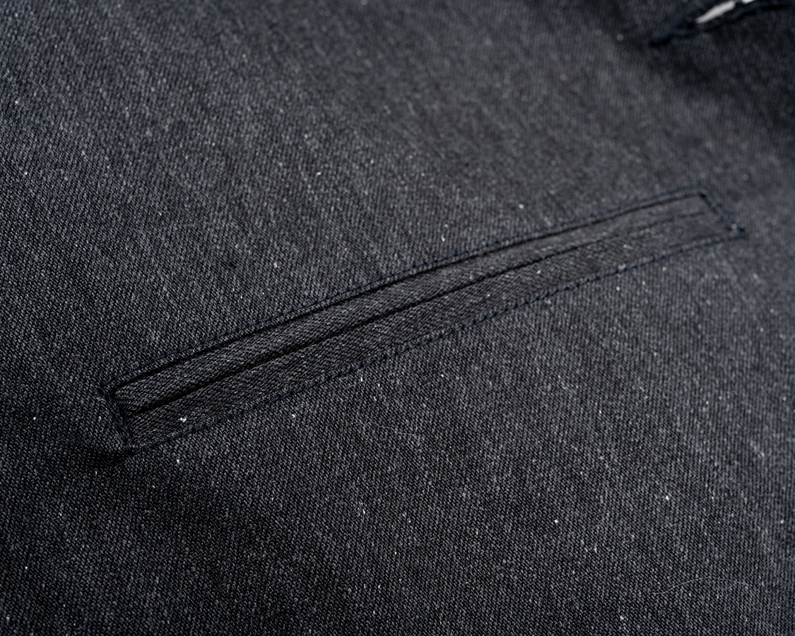 あえて一度止めている前端ステッチ。ここから上はラペル側表目、ここから下は身頃側表目。着た時にどちらもステッチの表目が出るように。