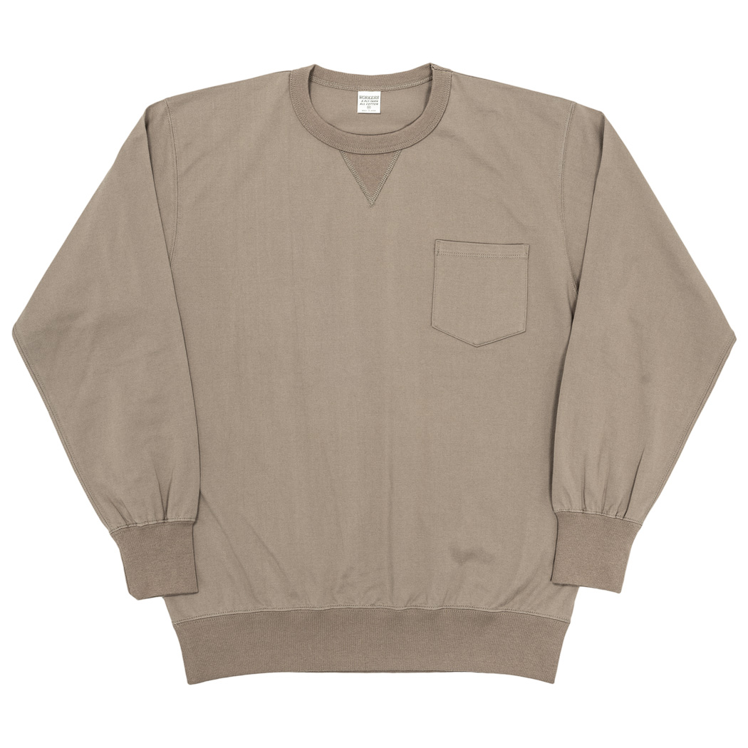 3 PLY Sweat Shirt、仕様はスウェットそのもの。前 V たたきつけ、袖口・裾はリブできゅっと絞る。首回り、リブ太め バインダー始末。首回りをリブでパイピング状に縫うので厚みが出て伸びにくい始末。