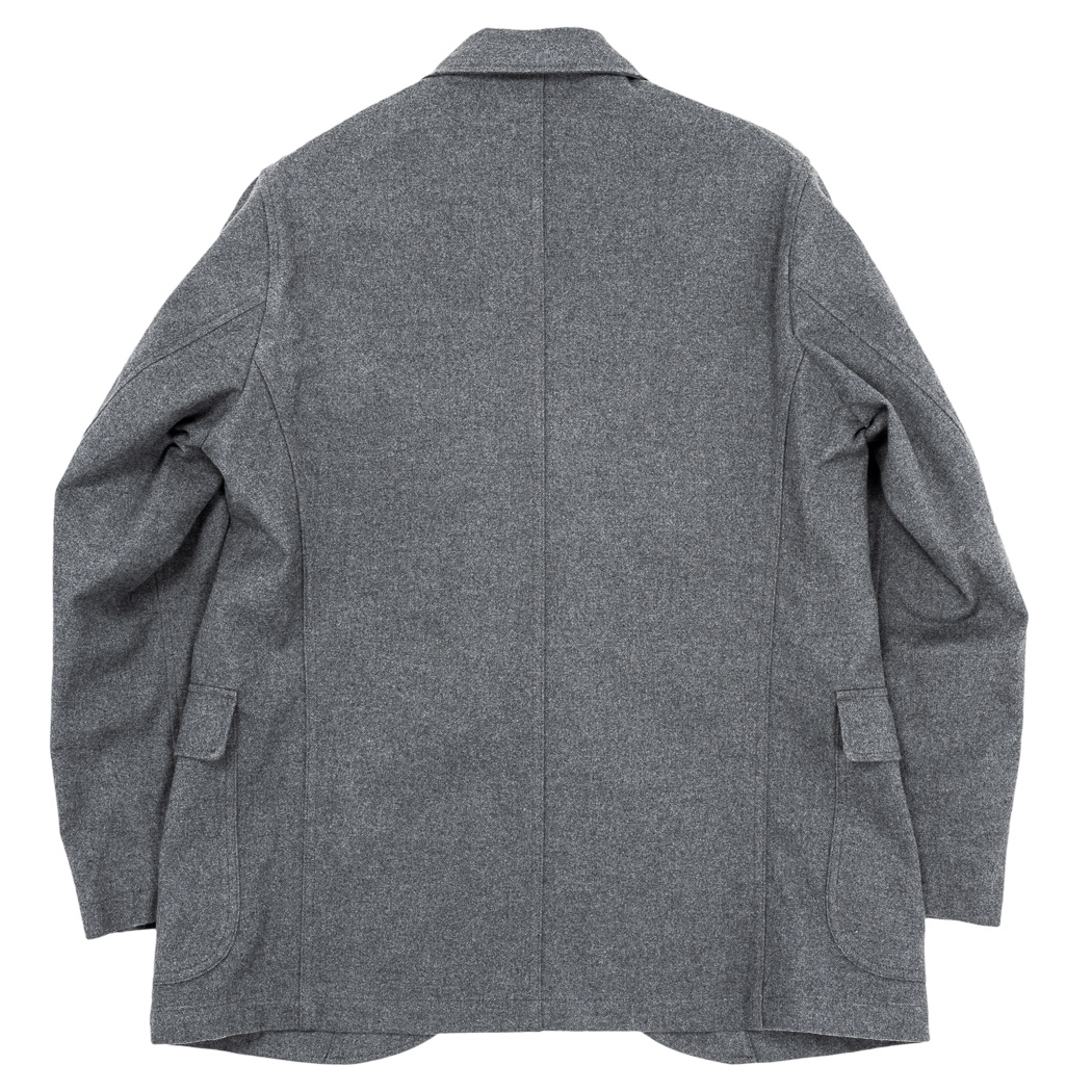 形は三つボタンの上二つがけ。3パッチで腰だけフラップ有り。大見返しに左右玉縁ポケット。袖ぐりはパイピング。