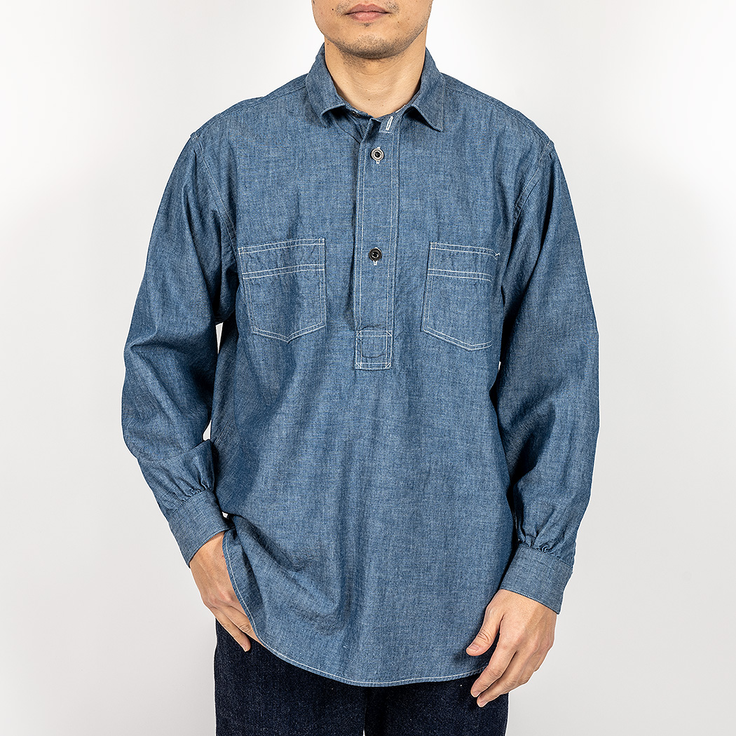 シャンブレー、5.5 オンス。通年着られる重さ・厚み。春から初夏は袖をまくって。真夏は1枚で。秋冬はインナーに。
