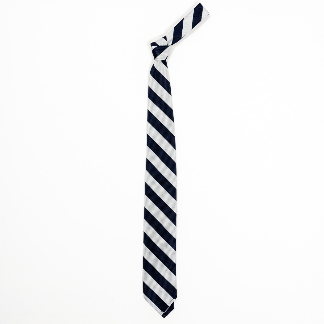 レジメンタルタイ、柄の流れはアメリカ式に左上から右下に流れるよう、裁断。 縫製はあえてミシンステッチで剣先を三つ巻き。剣先に裏地がつかない分、軽やか。芯も薄め、かつノットの部分を細い型紙。これが、WORKERSのネクタイ独特な「細いノット(結び目)」を生み出します。