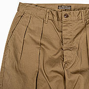 腰回り・ヒップにゆとりがあるので動きやすい。裾はあえてジーンズのような1センチ程度の幅の三巻始末。腰のタック見ると、古いミリタリーのチノパン あたりをモデルにしているのかな?とは思いますが。全体の仕様は80-90年代的な簡素で強度はしっかりあるもの。この「レプリカとも違う」「80年代、ぎりぎりMade in USAでやれる範囲」の仕様を再現しています。