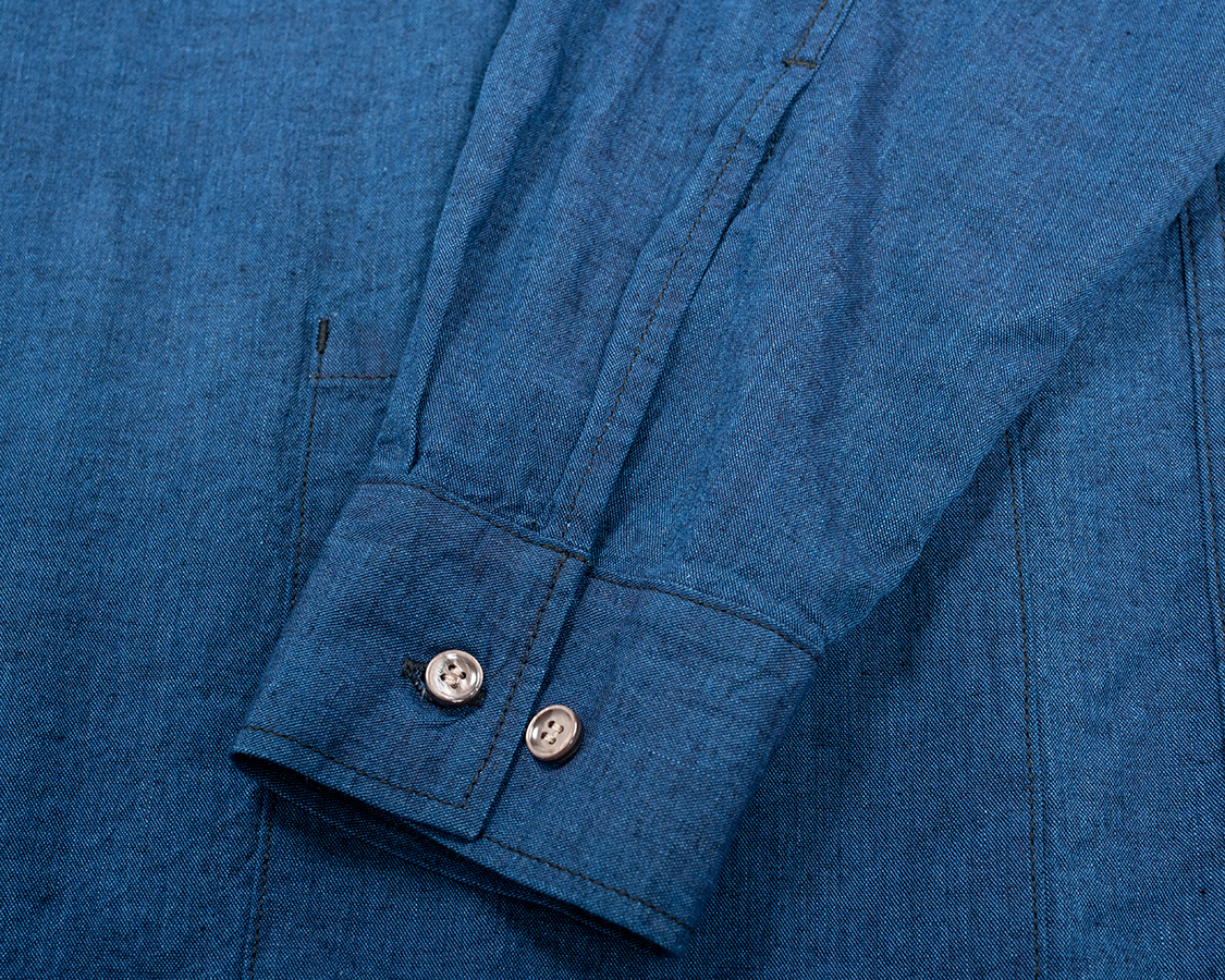 羽織りものではあるけれど、夏場に着る事を想定しているので袖をまくりたい。そこで、カフス+深めの開き。これで、肘上ぐらいまでまくることができます。