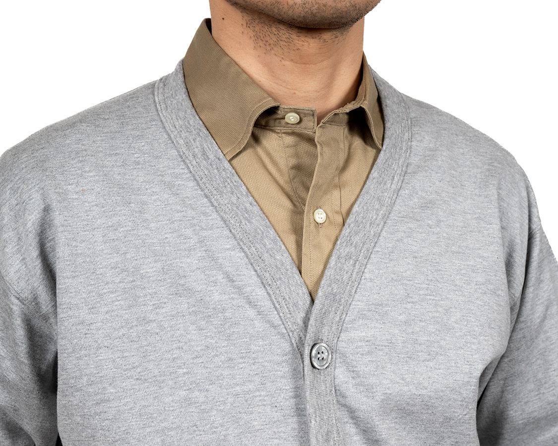 深すぎず、浅すぎずの前V。ボタン、以前は小さめを使っていましたが、今回は「典型的なニットカーディガン」でよく使われるサイズに。止めて・外してが一番しやすいサイズです。