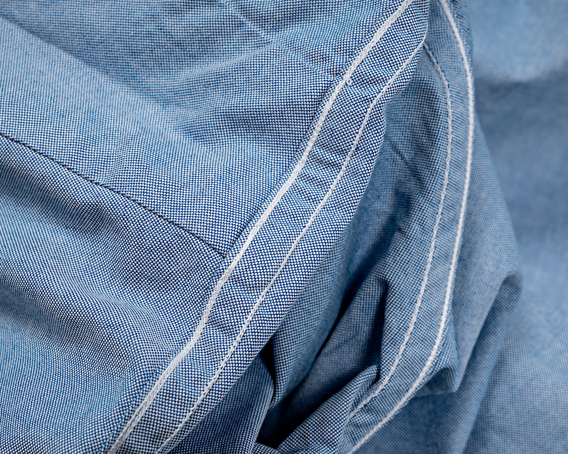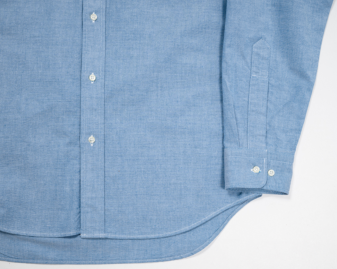 アメリカ製ボタンダウンでよくあった仕様で、本来は大量に作るための仕様でした。が、全然大量生産なんかしない日本でこれを再現するのは至難の業。工場さんが設備を入れてくれたので、それ以来、この環縫い・折伏せしようにはこだわっています。