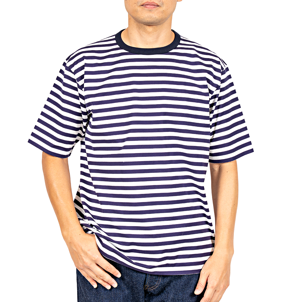 今回のボーダー、中に何も着ないで1枚で着てちょうどよいサイズ感。ヘインズ・赤/青ラベルのような薄いTシャツなら中に着られます。