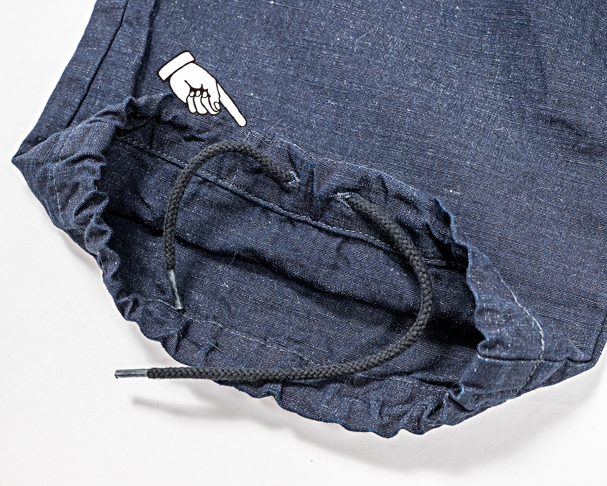 矢印部分、紐の出口は裏に布を当ててホールをあけています。1枚の生地にホールを開けると強度的に怖い。普通は裏に芯を貼ることが多いのですが、今回はここに共生地を裏にあててみました。