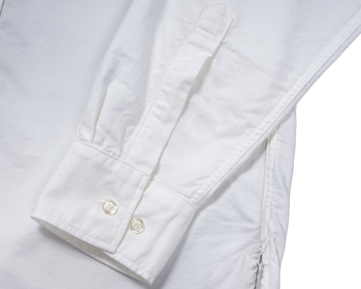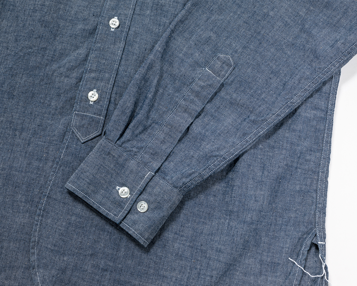 カフスは角形。胸ポケットも丸みを出さなかったので、カフスも角形で雰囲気を合わせています。