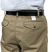 腰帯は「別帯」という別裁ちパーツで、裏はスレキ使い。このあたりは、チノパンというよりトラウザーズの仕様。