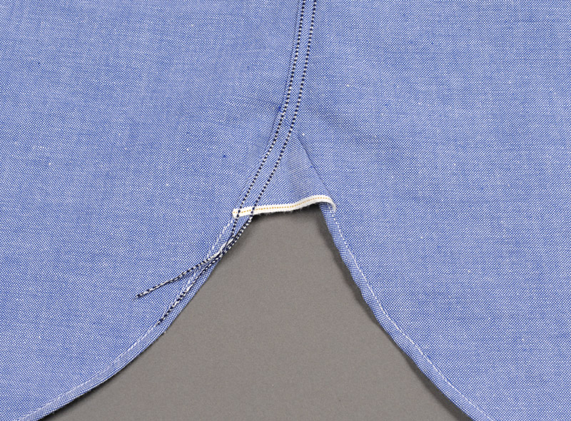 ボタンダウンシャツでは折伏せ縫いが多いのですが、そこをあえて、ワークの名残で巻き縫いにしてあります。